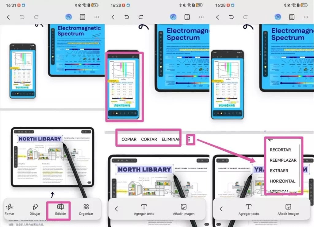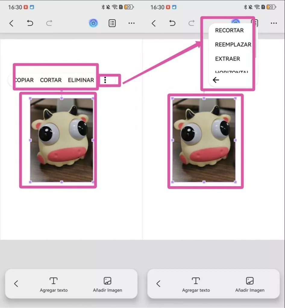 - Toque para seleccionar la imagen que desea editar. Puede COPIAR/CORTAR/ELIMINAR/RECORTAR/REEMPLAZAR/EXTRAER la imagen o voltear la imagen horizontal/verticalmente desde todas las opciones disponibles.