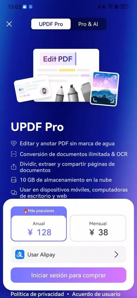 Puedes probar UPDF en Android con su versión de prueba gratuita, pero tiene algunas limitaciones. Para evitar esas limitaciones, debes actualizar a la versión Pro. ¿Pero cómo comprar y activar la versión Pro? Aquí tienes la guía.
