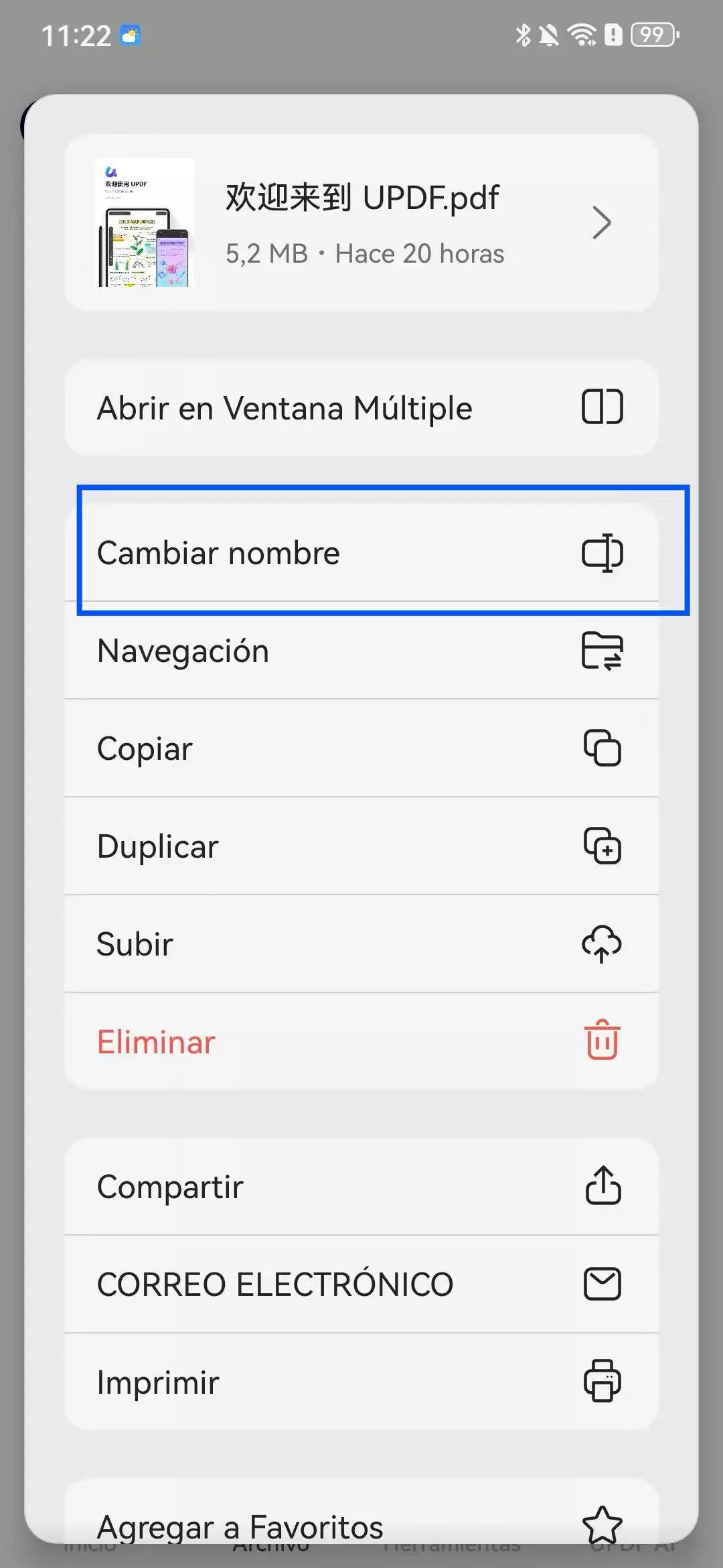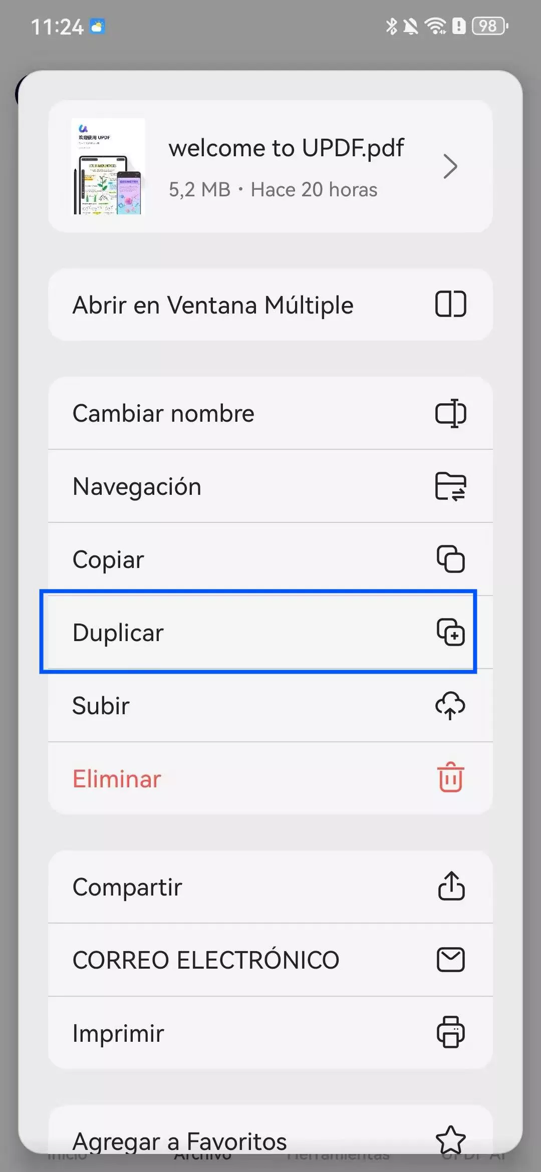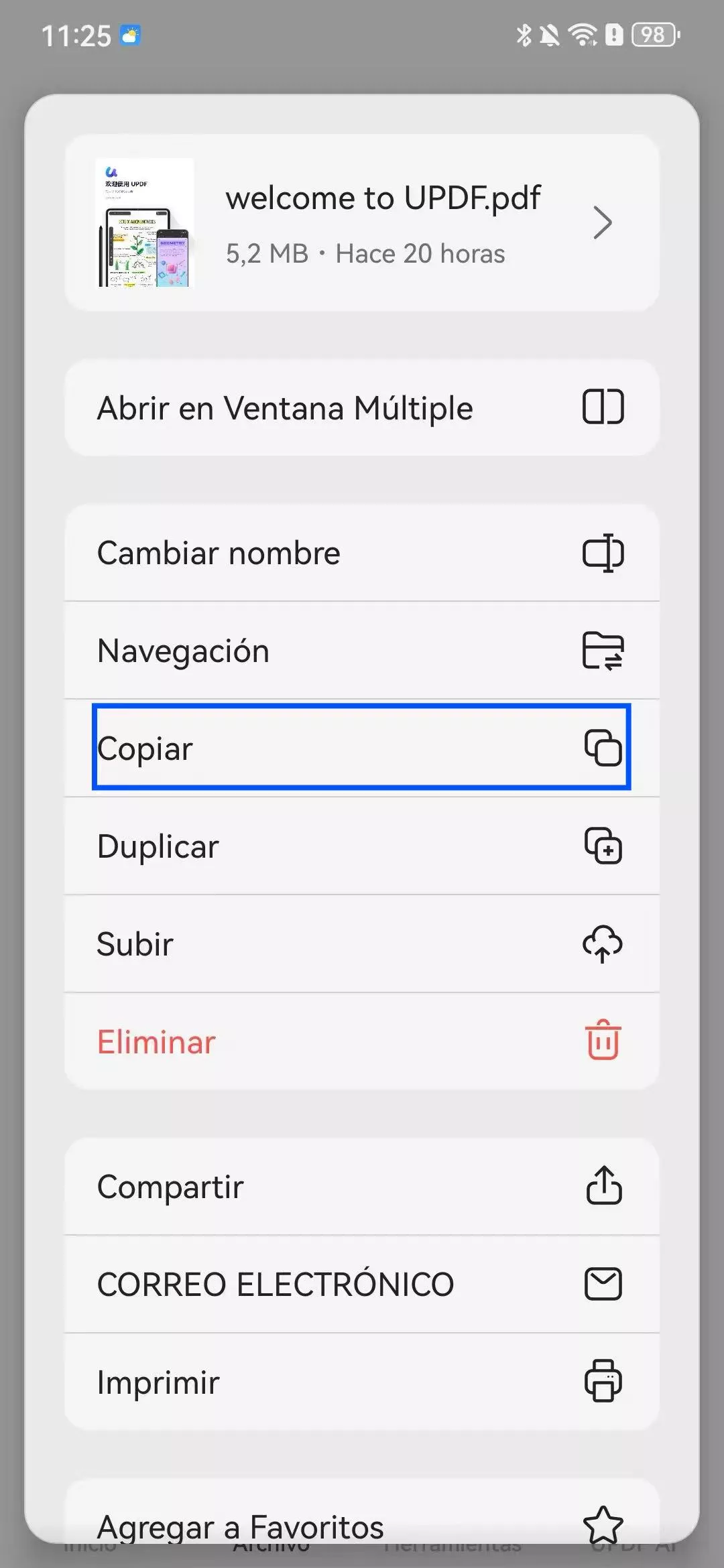Tienes la posibilidad de renombrar, copiar, duplicar, eliminar, marcar como favorito, mover, enviar por correo electrónico, compartir, copiar a UPDF Cloud, imprimir y crear una carpeta para ellos. Aquí, te mostraremos cómo gestionar documentos PDF con UPDF en Android, paso a paso. Puedes hacer clic en el botón de abajo o ir a la Play Store para descargarlo.