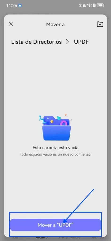 - O puedes tocar en el "+" para crear una nueva carpeta, nombrarla, tocar "Hecho" y luego tocar en "Mover a [Nombre de la carpeta]", y UPDF moverá el archivo PDF a la carpeta que creaste.