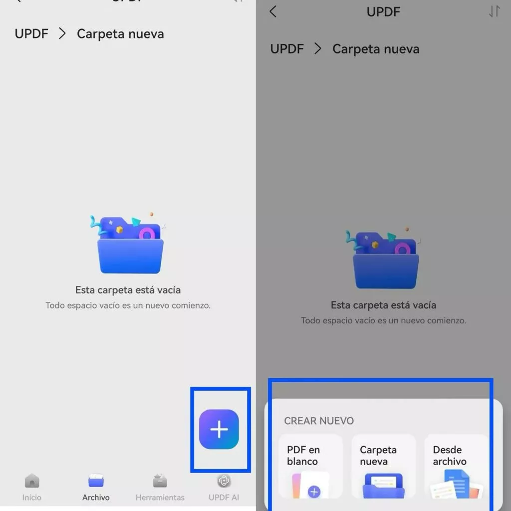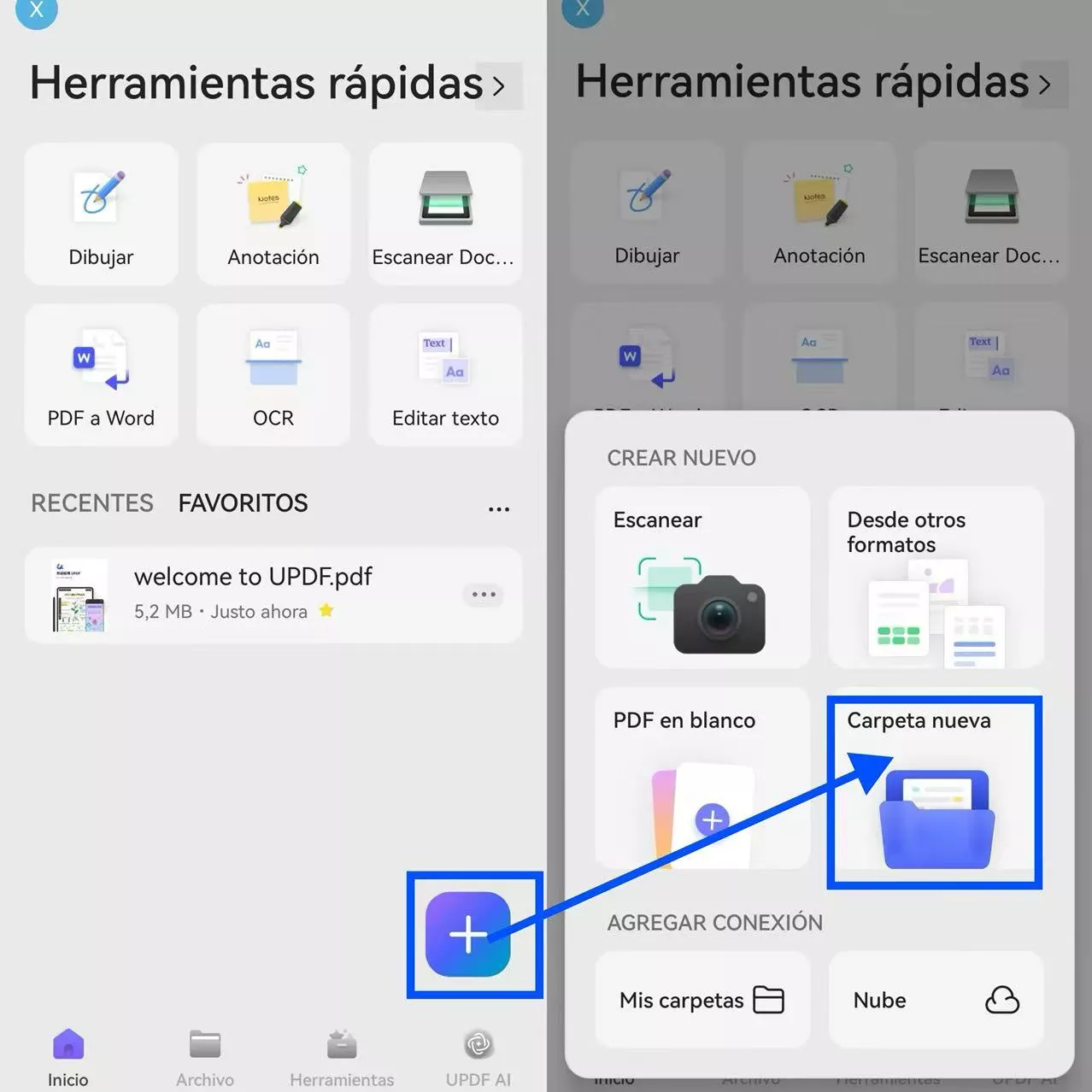- Para crear una carpeta, haz clic en el ícono "+" en la interfaz principal y selecciona "Carpeta nueva".