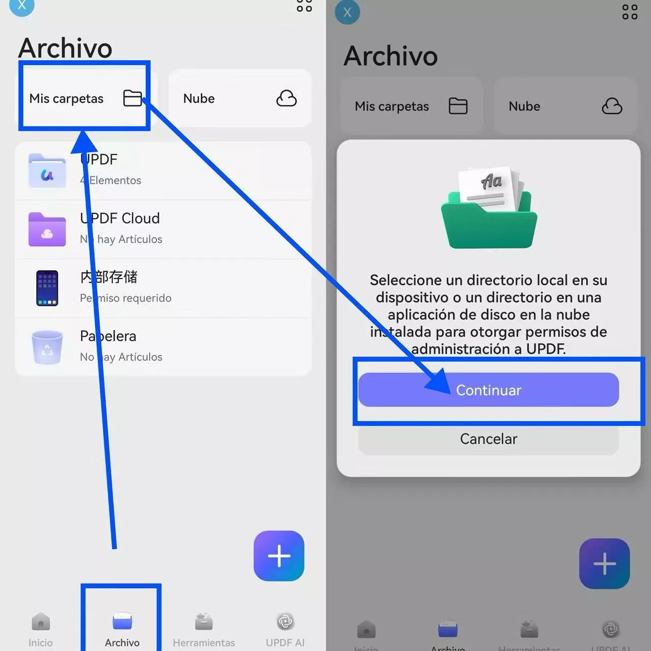 - Si deseas crear nuevas carpetas desde tu dispositivo Android en UPDF, haz clic en "Mis carpetas" en la interfaz de "Archivos". UPDF te pedirá que le otorgues permisos de gestión para un directorio local en tu dispositivo o un directorio en una aplicación de almacenamiento en la nube instalada. Por favor, haz clic en "Continuar" para proceder al siguiente paso.