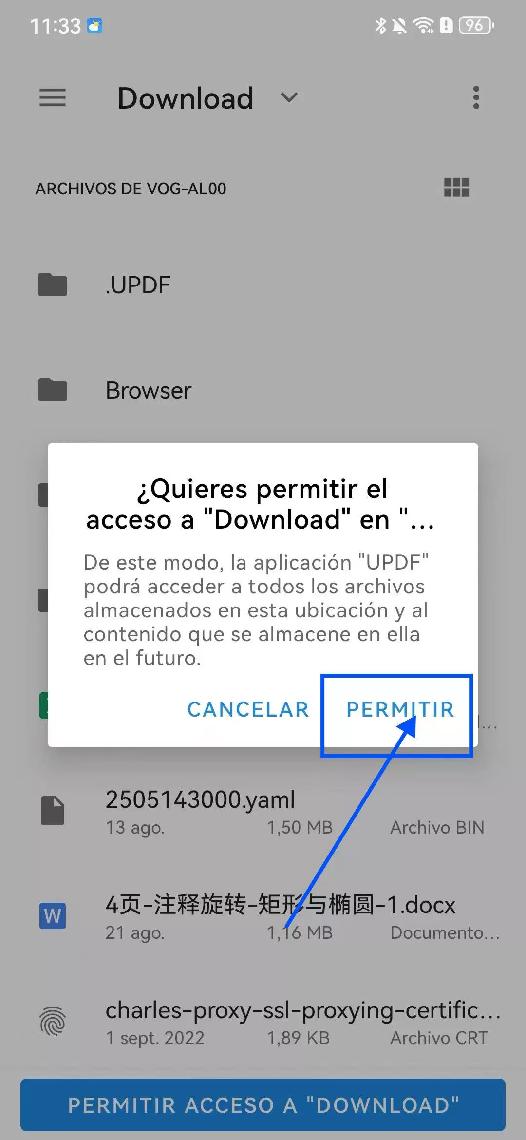 - Selecciona una carpeta en tu dispositivo Android. UPDF te pedirá que permitas el acceso a los archivos de esta carpeta. Luego, haz clic en "Permitir".