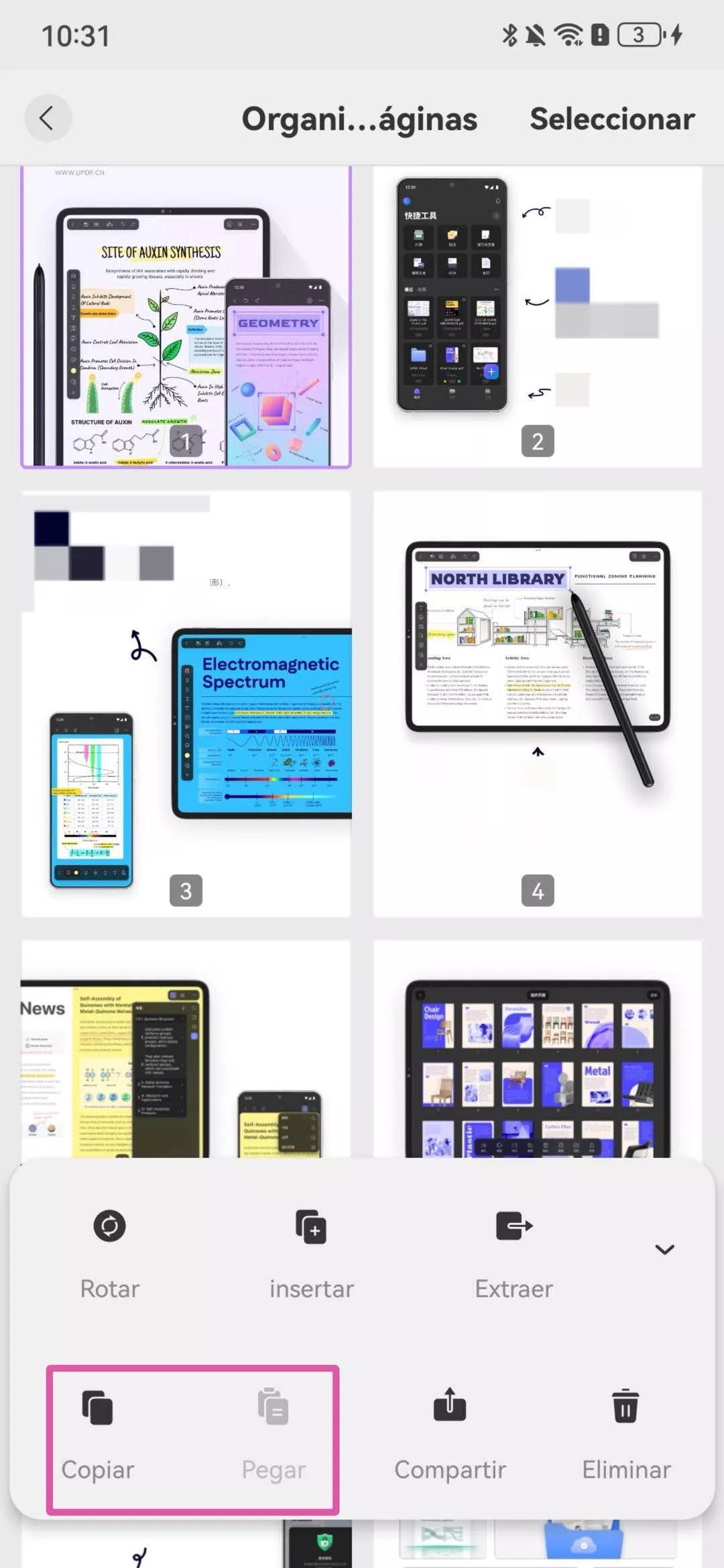 Selecciona la página que deseas duplicar, toca "Copiar" y luego utiliza la opción "Pegar".