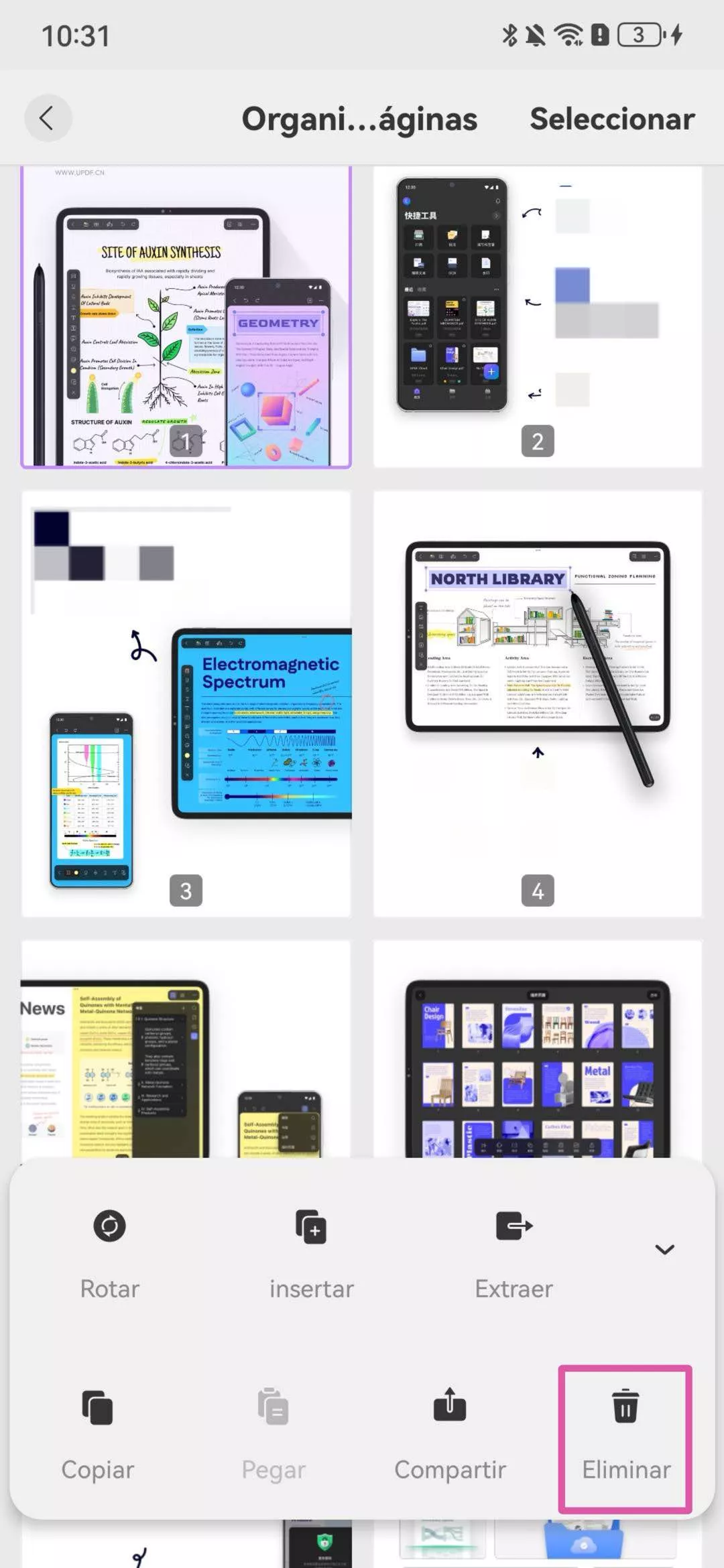 Si necesitas eliminar páginas específicas del PDF, selecciónalas y toca los tres puntos para acceder a la opción "Eliminar". Confirma tu decisión y las páginas serán removidas.