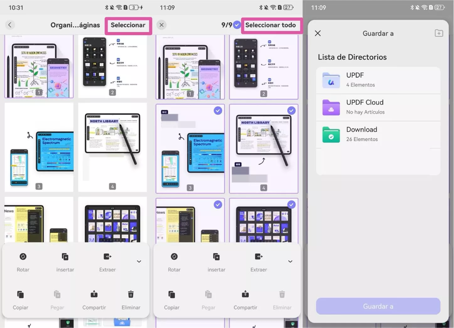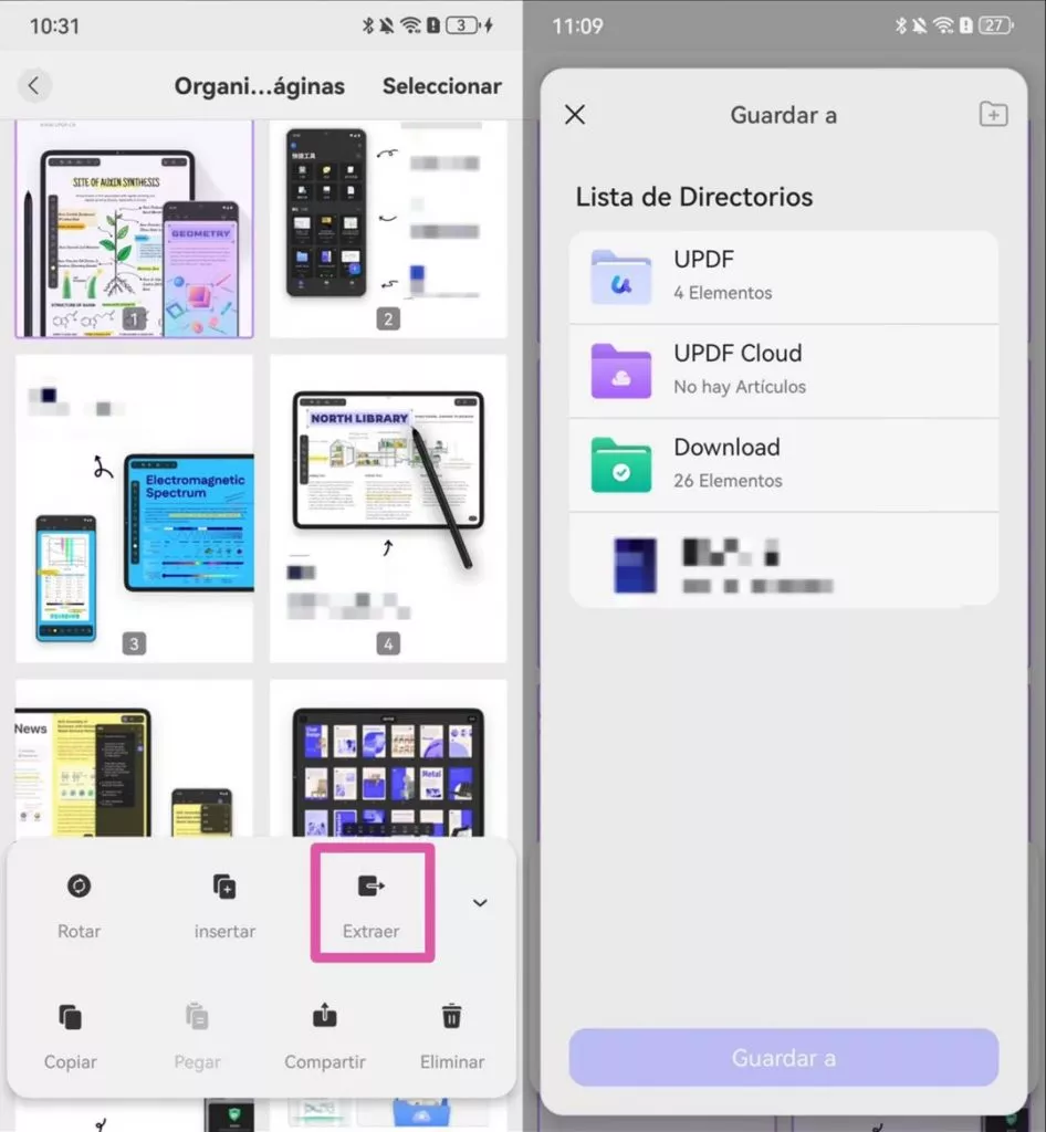 Simplemente selecciona las páginas que deseas extraer, toca Extraer y designa un directorio para guardar las páginas extraídas.