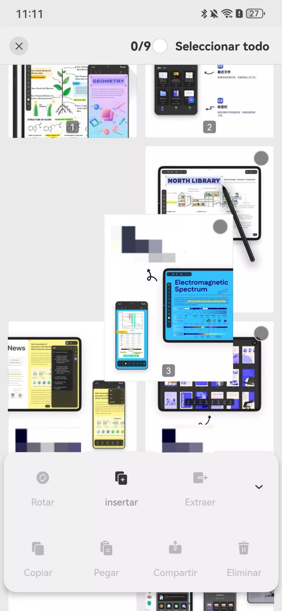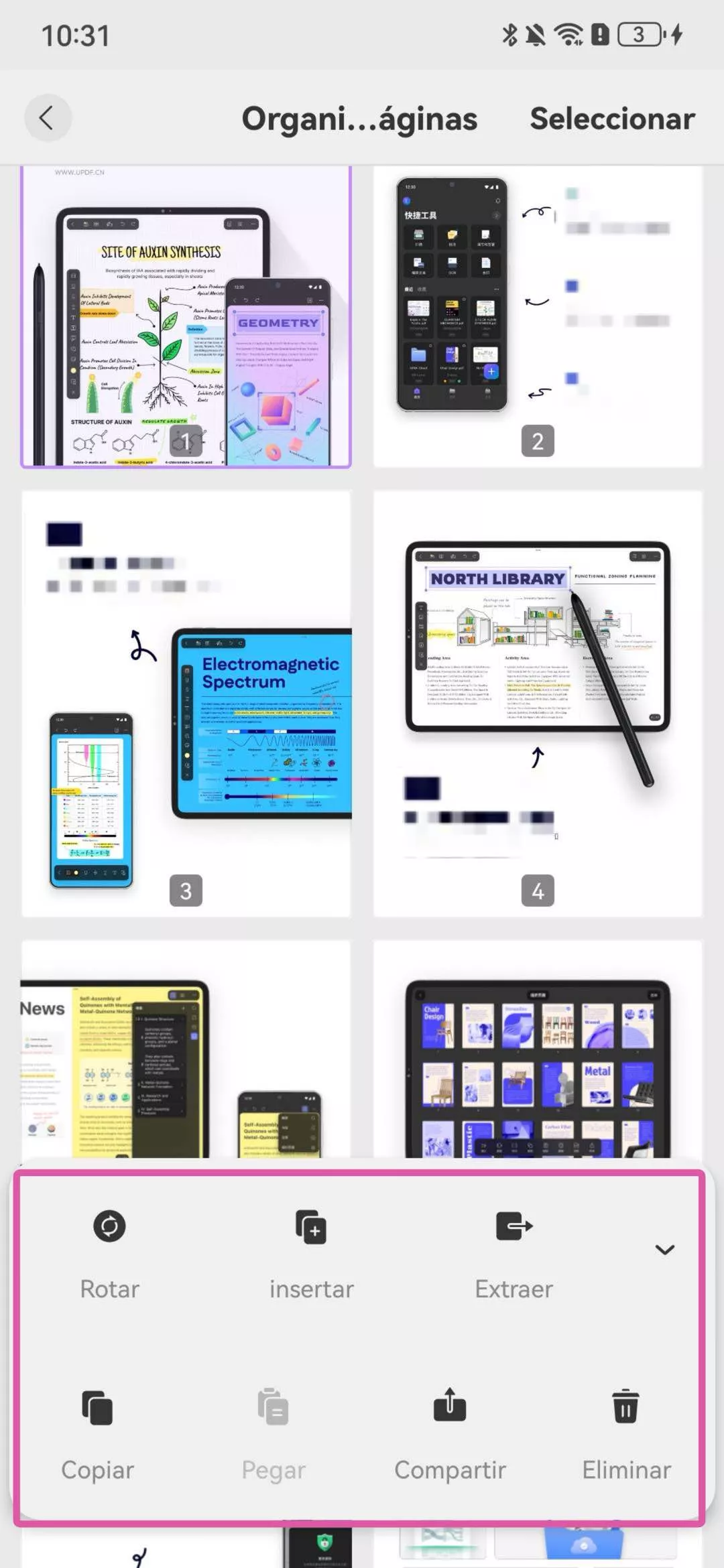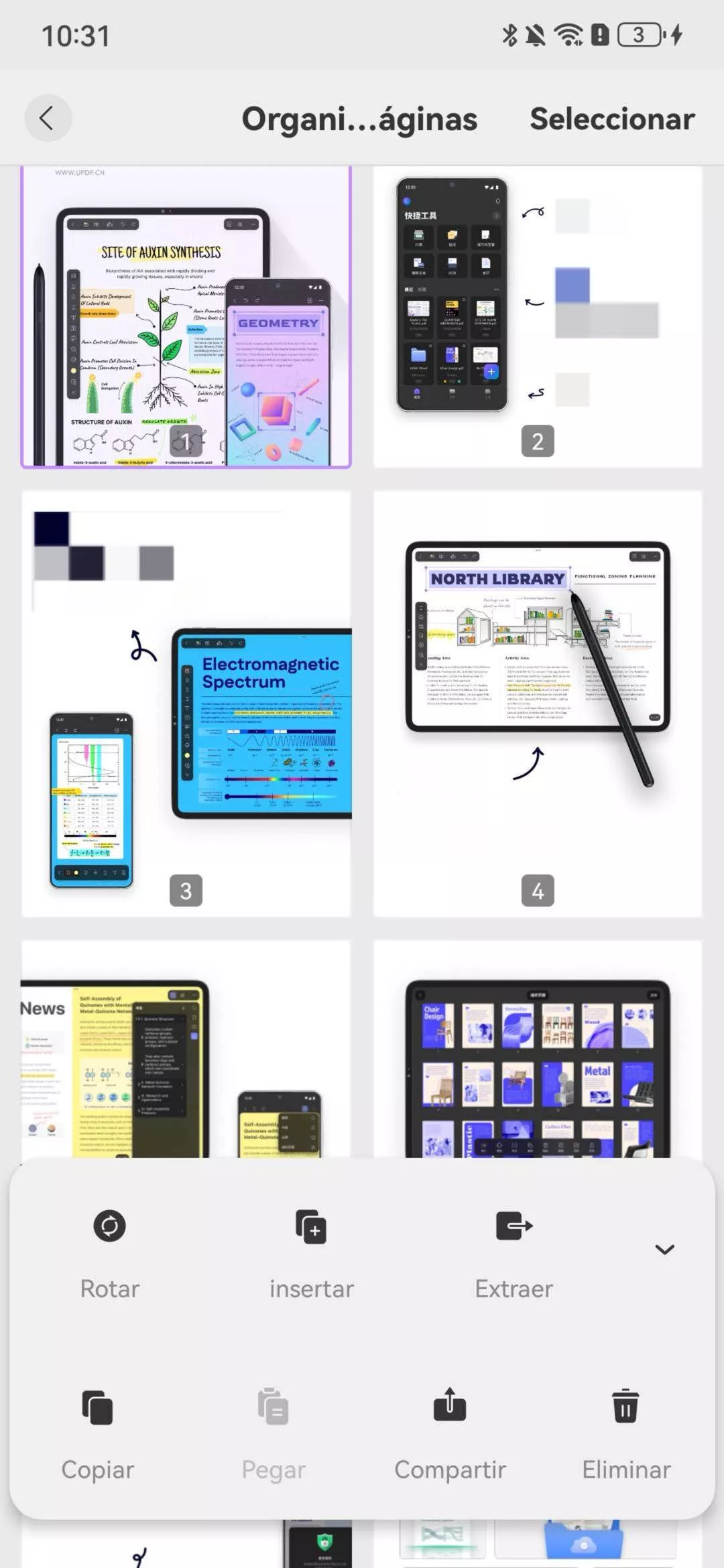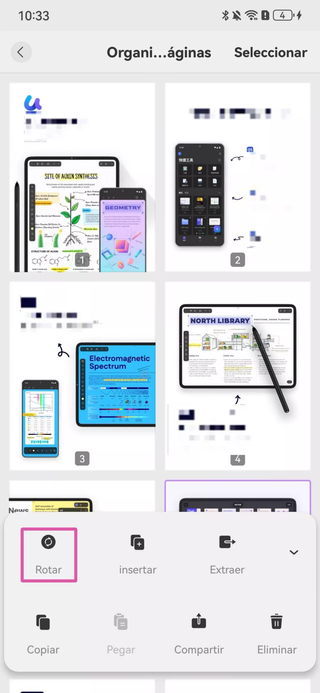 Para girar una página, simplemente tócala para seleccionarla. Luego, pulsa la opción "Girar" para rotar la página seleccionada.
