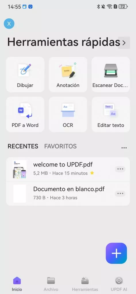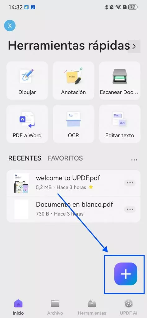 Paso 1. Si nunca has utilizado UPDF antes, primero haz clic en el botón "+" abajo para importar archivos desde tu dispositivo Android a UPDF.