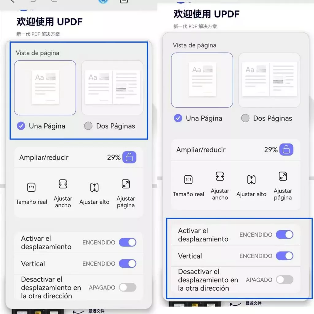 Paso 3. Personaliza la configuración de la vista. Aquí puedes cambiar la vista de página ("Página individual" o "Dos páginas") y controlar el comportamiento del desplazamiento en la pantalla. "Habilitar desplazamiento" te permite mover hacia arriba y hacia abajo en la pantalla. La opción de orientación "Vertical" mantiene la pantalla en una posición vertical, a menos que la desactives. "Deshabilitar desplazamiento en la otra dirección" detiene el movimiento en esa dirección particular, proporcionando un mayor control sobre cómo ves el contenido en tu dispositivo. Ajustar estas configuraciones puede ayudarte a personalizar tu experiencia de navegación o visualización según tus preferencias y necesidades.