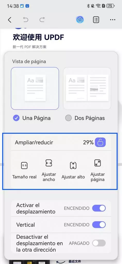 Paso 4. También puedes hacer zoom in o zoom out para una mejor experiencia. Simplemente toca "Ajustar página", "Tamaño real", "Ajustar ancho" o "Ajustar alto" en la sección "Zoom". Haz clic en el ícono de candado para bloquear la escala de zoom actual.