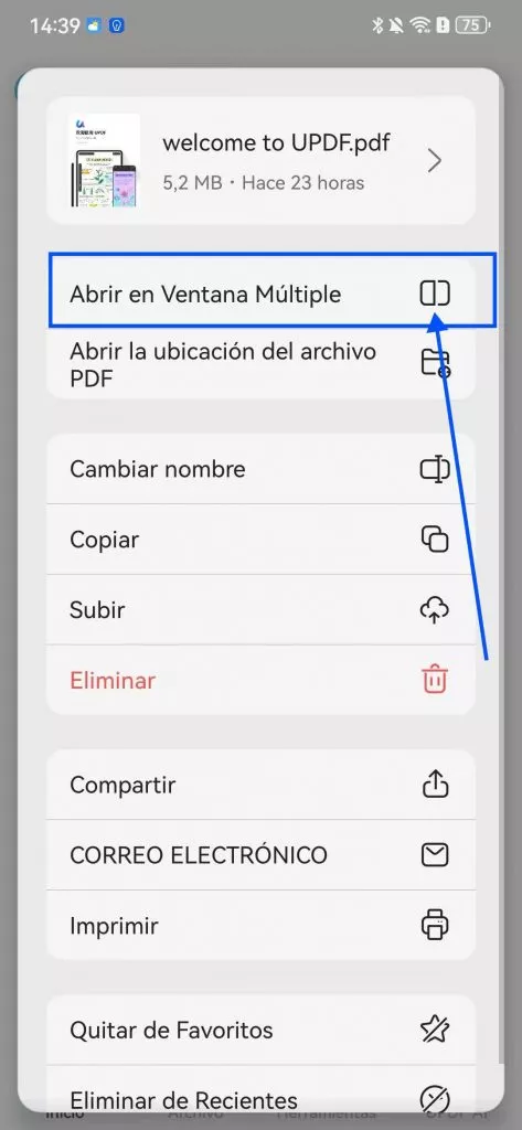 - Desde la página de inicio, abre otro documento desde el lugar donde almacenas los archivos en UPDF. Luego, desliza hacia arriba nuevamente para acceder a la vista de multitarea de tu teléfono. En la vista de multitarea de tu teléfono, toca el ícono de la ventana para habilitar la pantalla dividida para uno de los documentos (los pasos pueden variar según el dispositivo).