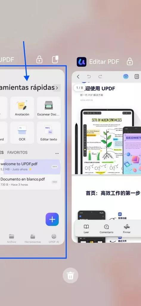 - Dado que el documento ahora se abre en una nueva ventana por defecto, puedes deslizar hacia arriba desde la parte inferior de tu teléfono para acceder a la vista de multitarea de tu teléfono, luego haz clic en la página de inicio de UPDF en la vista de multitarea.