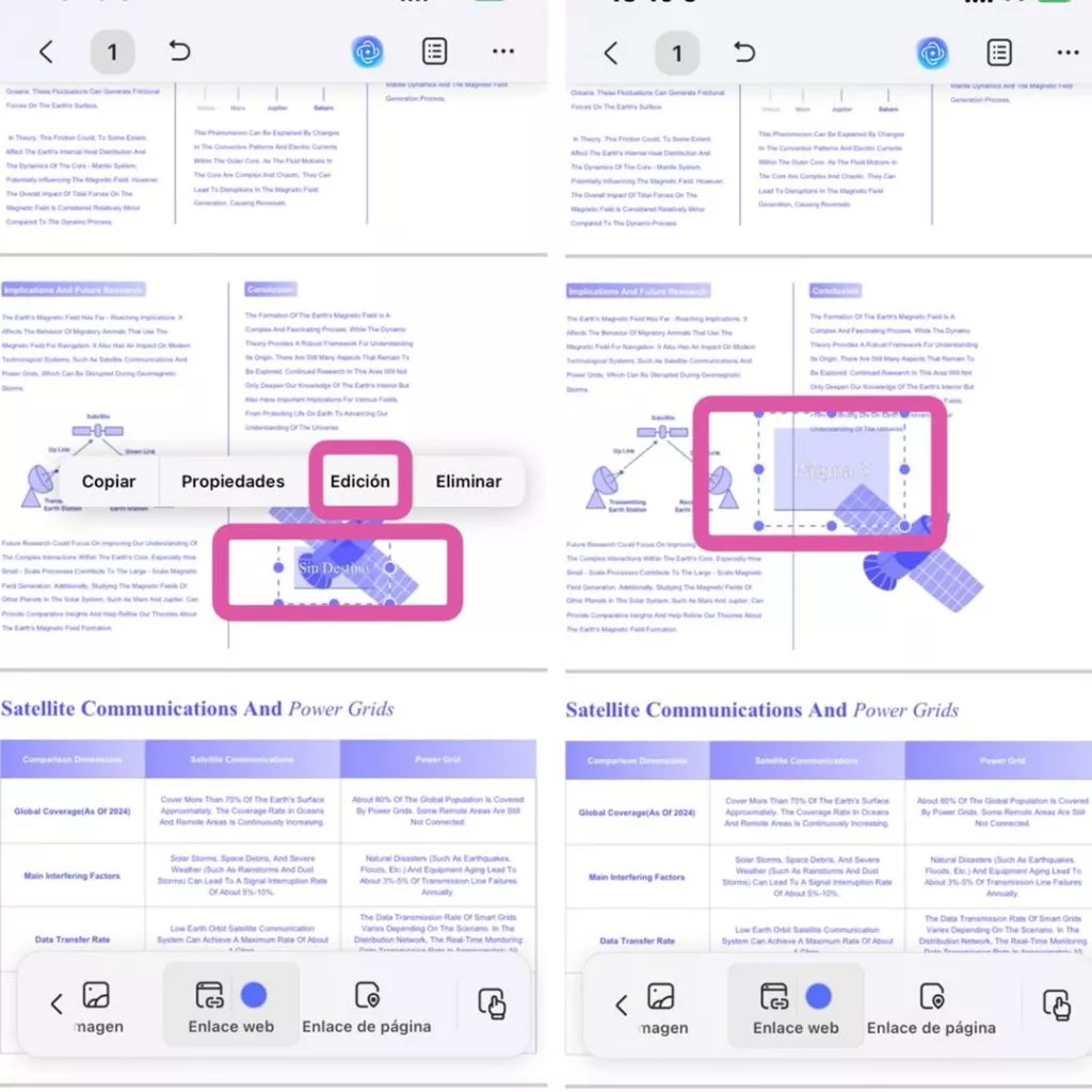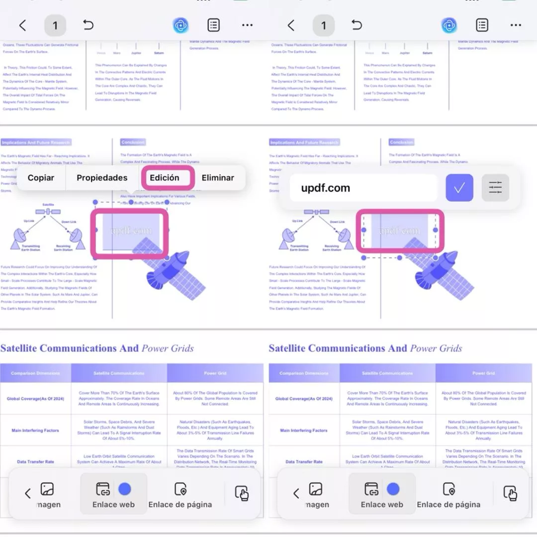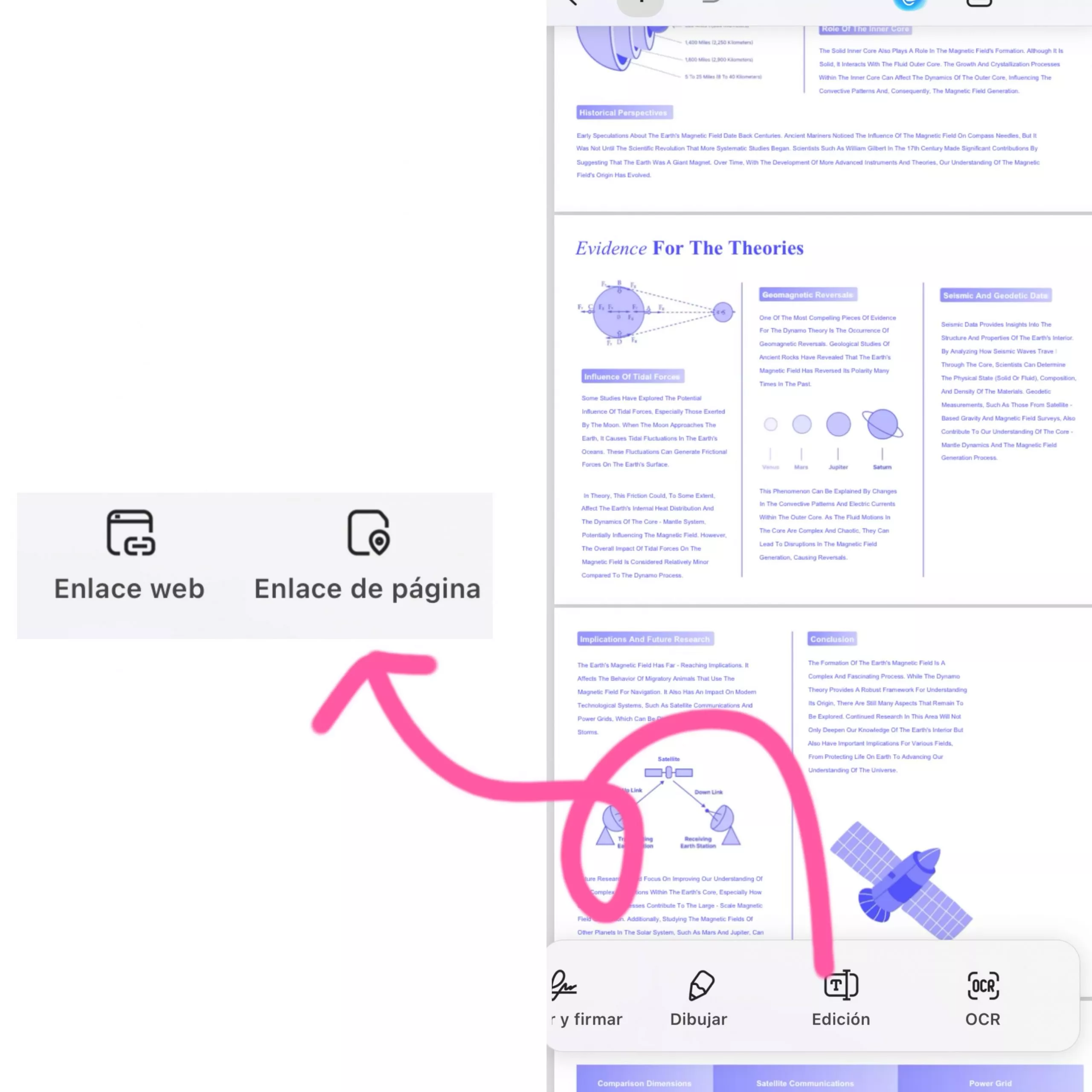 - La opción "Enlace a la Web" te permite ingresar la dirección URL deseada y, al tocar el enlace, navegar a la página especificada después de aplicar el enlace.La opción "Enlace a la Página" requiere que ingreses el número de página deseado.