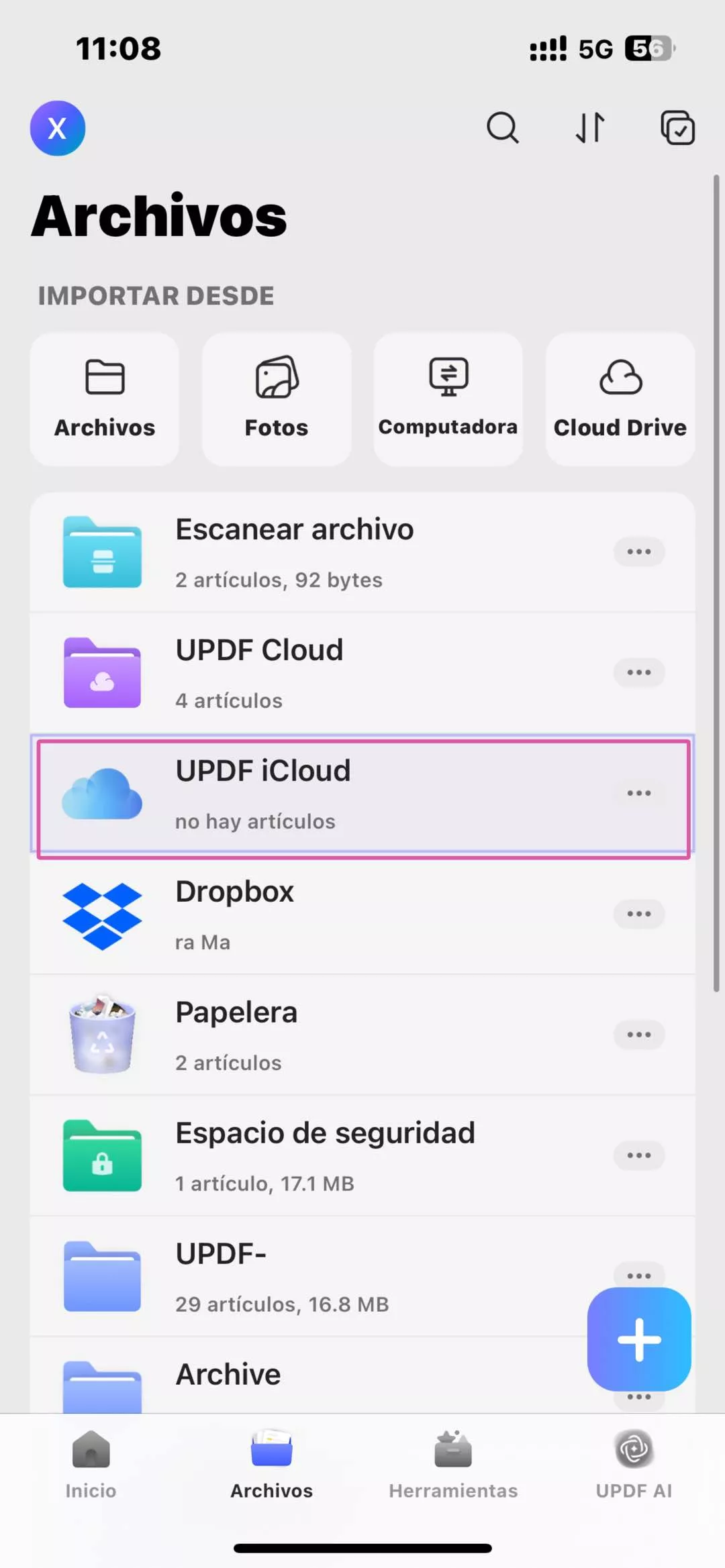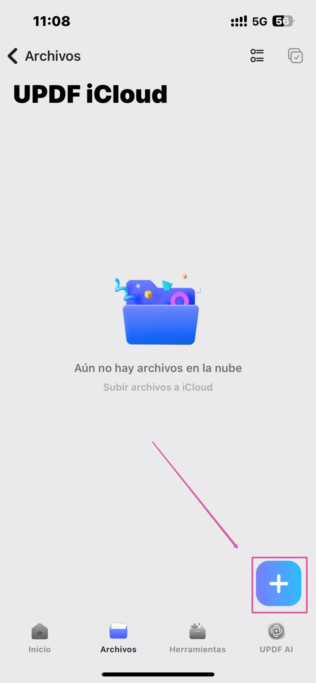 Si desea cargar archivos a iCloud, debe abrir la interfaz principal de la aplicación UPDF y acceder a la sección "Archivos". Busque y pulse "UPDF iCloud".