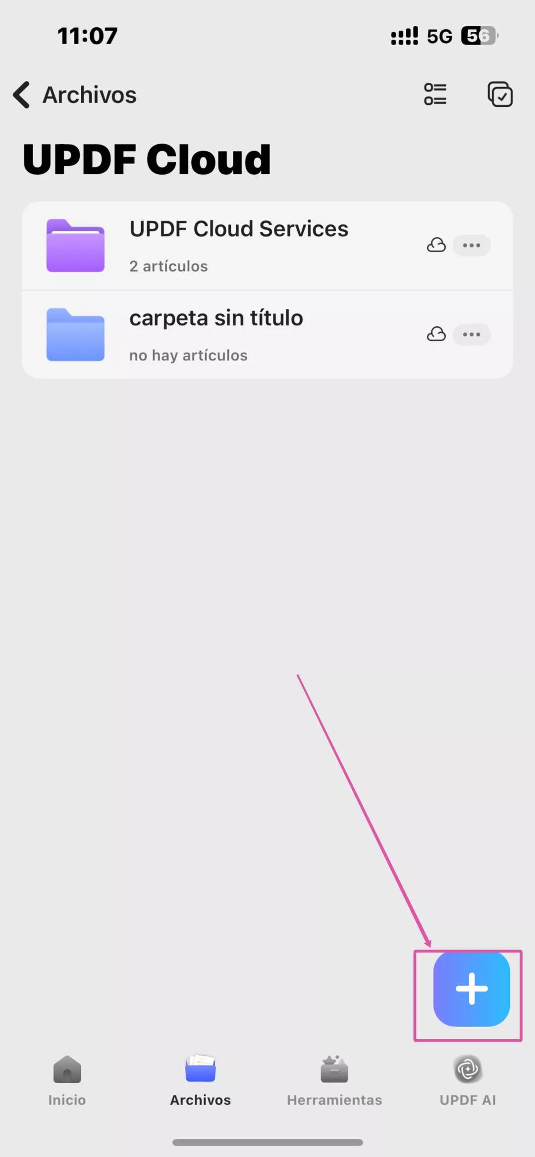 En la interfaz de UPDF Cloud, pulse el botón "+" y seleccione los archivos que desea cargar desde su dispositivo.