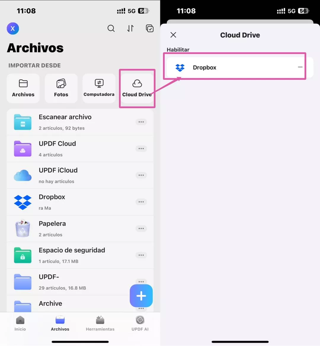 Para sincronizar archivos con Dropbox a través de UPDF, abra la interfaz principal de la aplicación UPDF y acceda a la sección "Archivos", busque y pulse "Unidad en la nube" y, a continuación, pulse "Dropbox" para establecer la conexión entre UPDF y Dropbox.