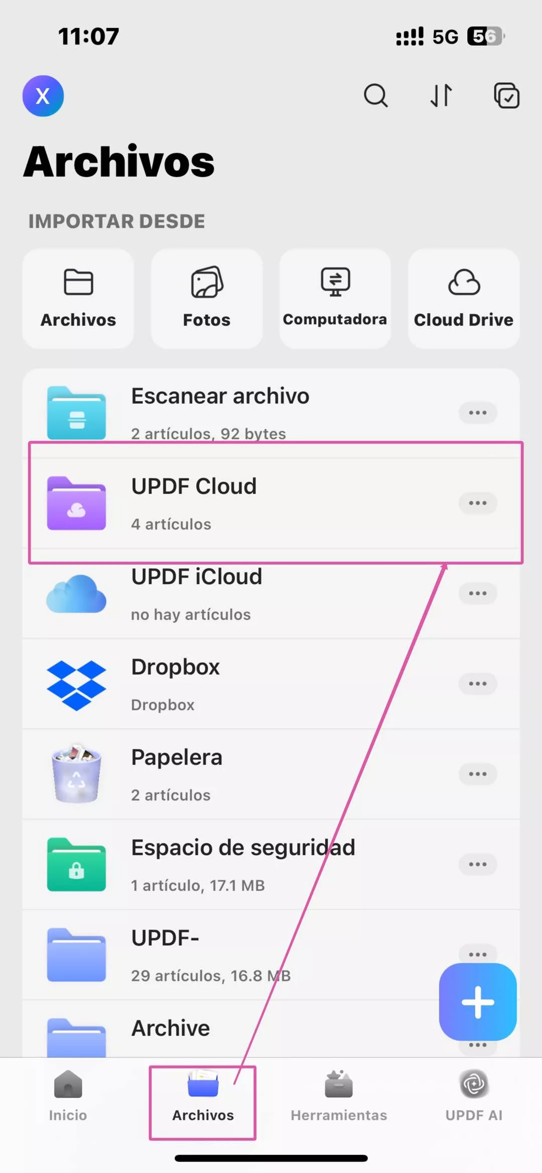 Abra la interfaz principal de la aplicación UPDF y acceda a la sección "Archivos". Busque y pulse "UPDF Cloud".