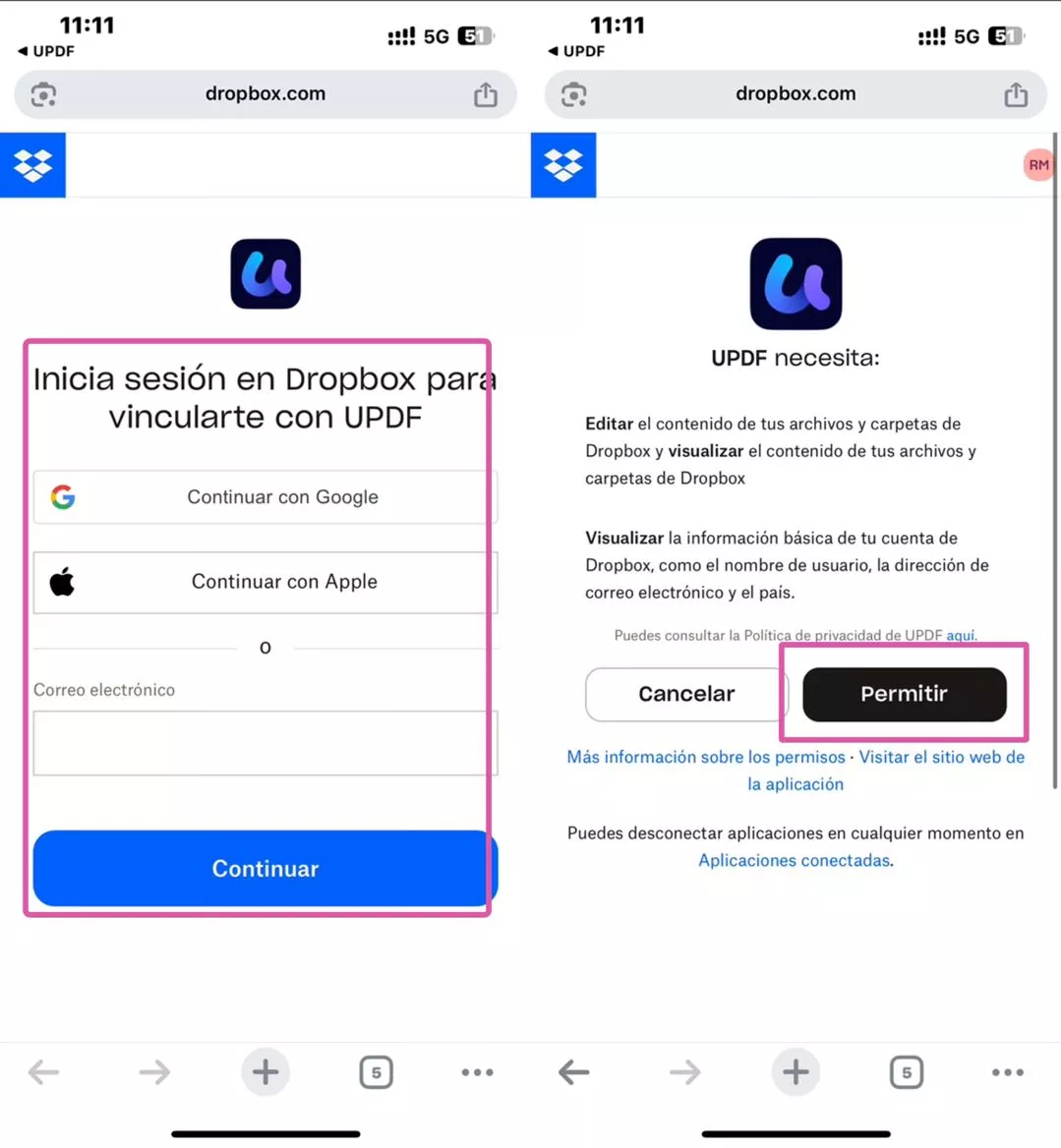 Haga clic en "Dropbox" para vincular su cuenta de Dropbox. Después de iniciar sesión, haga clic en "Permitir" para conceder a UPDF permisos de edición y visualización de sus archivos y carpetas de Dropbox.