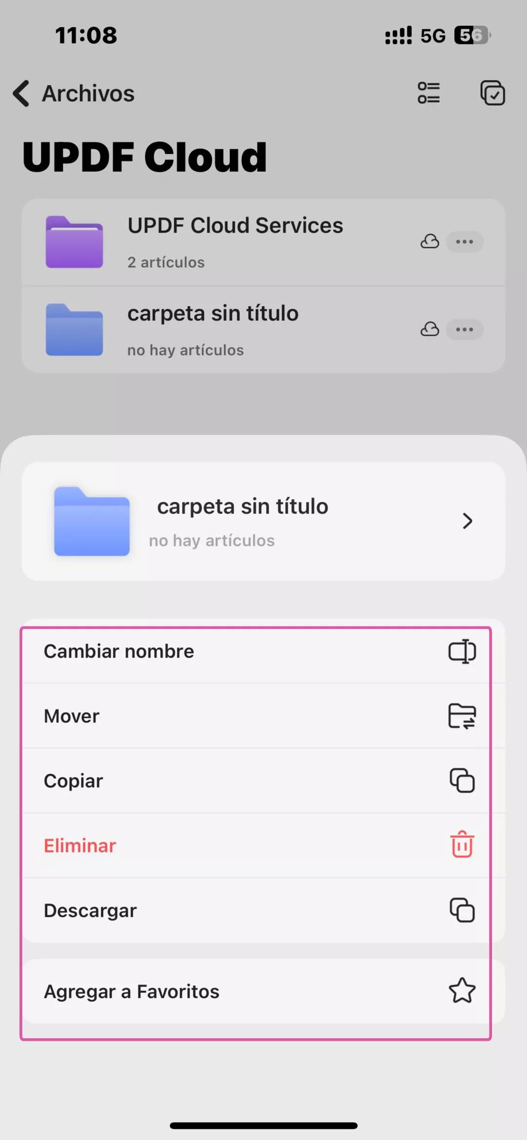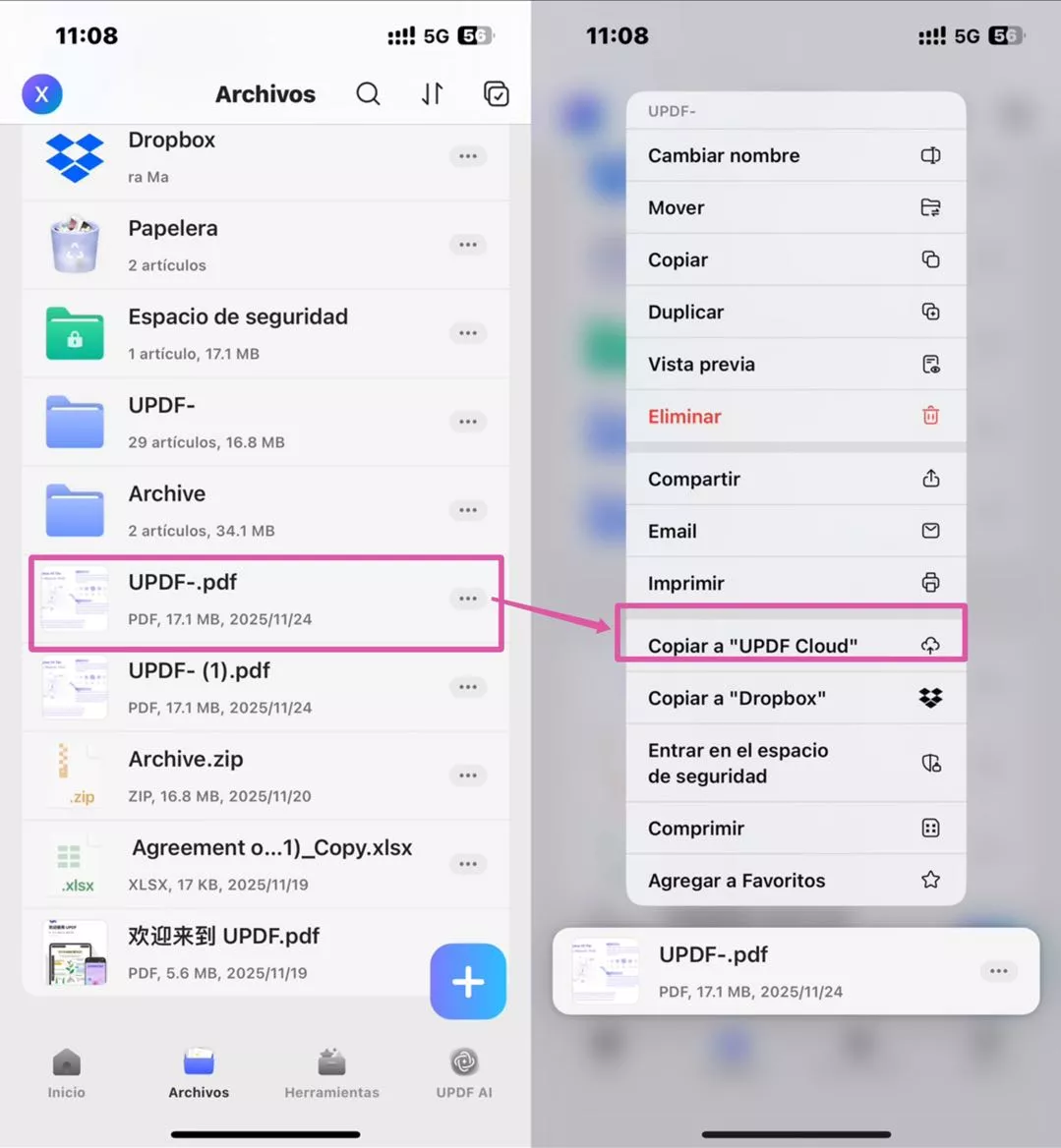 Para un archivo individual, existe otra forma de cargarlo a UPDF Cloud sin necesidad de abrirlo: mantenga pulsado el archivo en la página de inicio o en la sección de archivos con el dedo. Esto hará que aparezca una barra de herramientas con acciones disponibles para dicho archivo. Luego, simplemente seleccione "Copiar a UPDF Cloud" en la barra de herramientas..