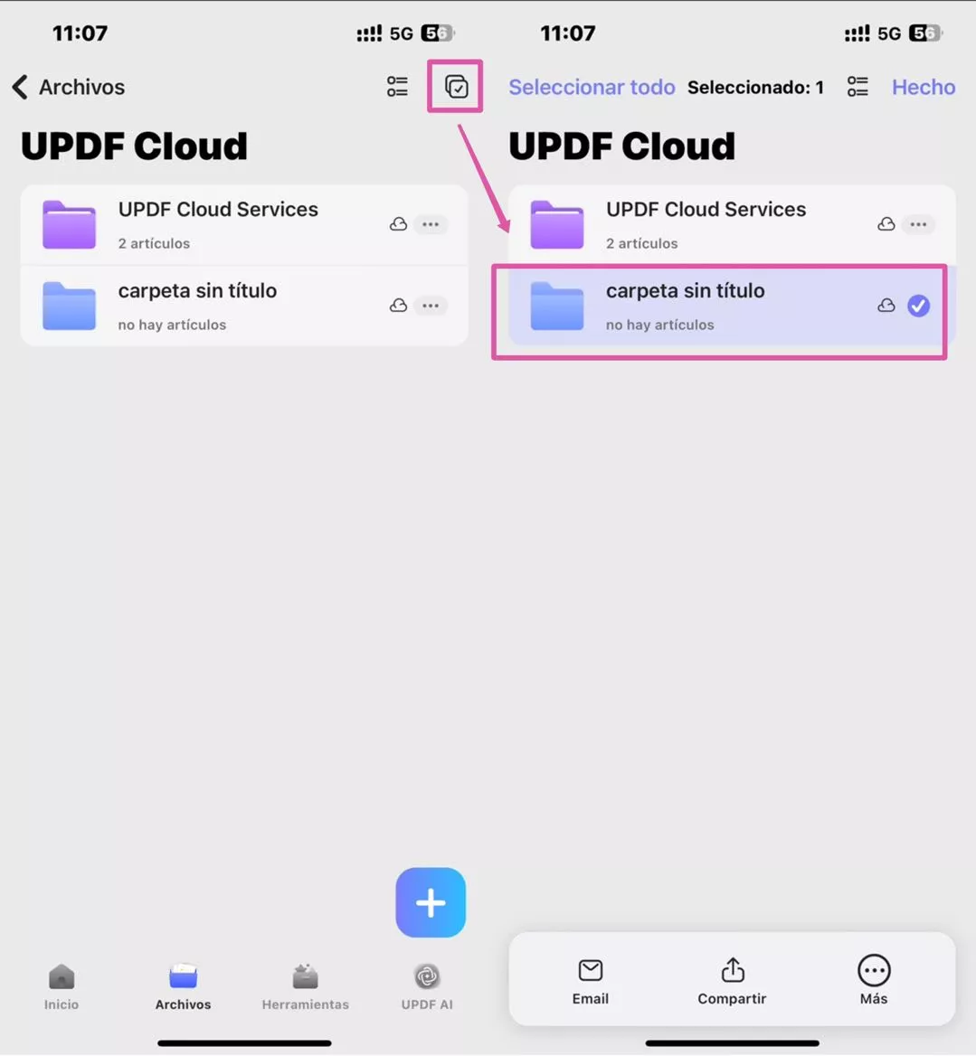 Pulse el icono de selección en la esquina superior derecha. Ahora puede seleccionar los archivos o carpetas que desea compartir, y utilizar los botones "Correo" o "Compartir" de la parte inferior para distribuir los archivos en diferentes lugares y con distintas personas.