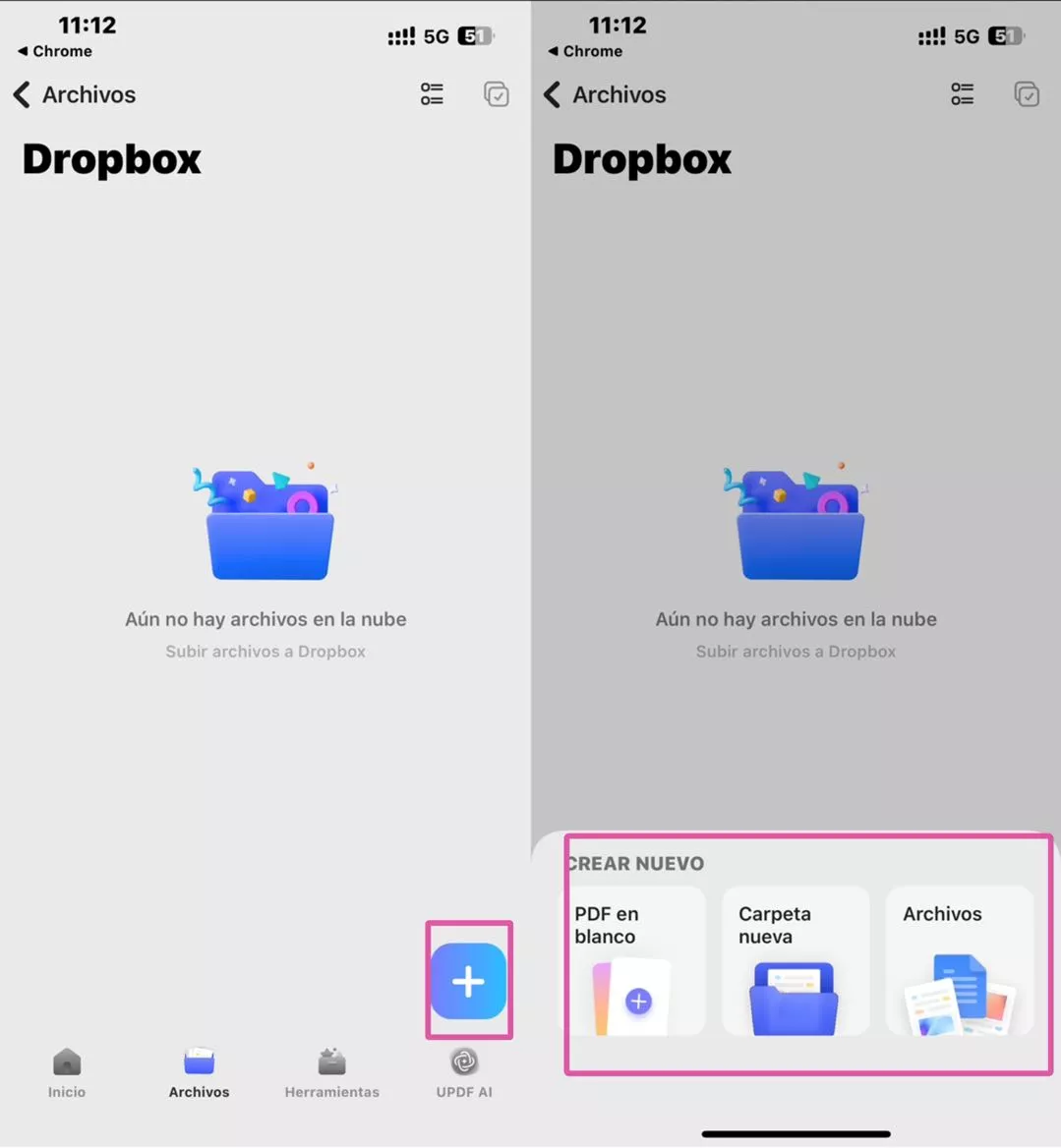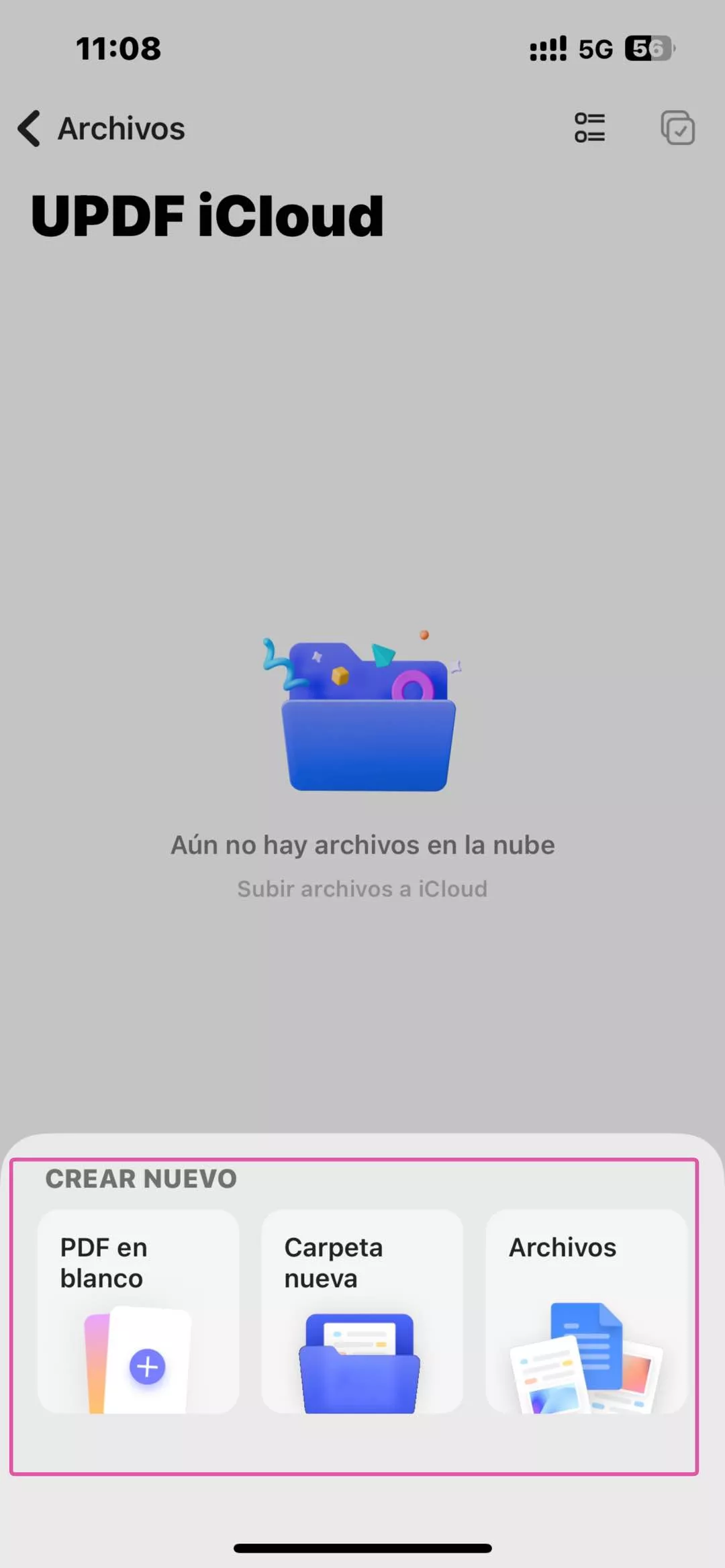 Desde la ventana emergente, el botón "Archivo en blanco" le permite crear un nuevo archivo PDF en iCloud. El botón "Nueva carpeta" le permite crear una nueva carpeta de archivos. El botón "Desde Archivos" le permite importar archivos desde otras ubicaciones.