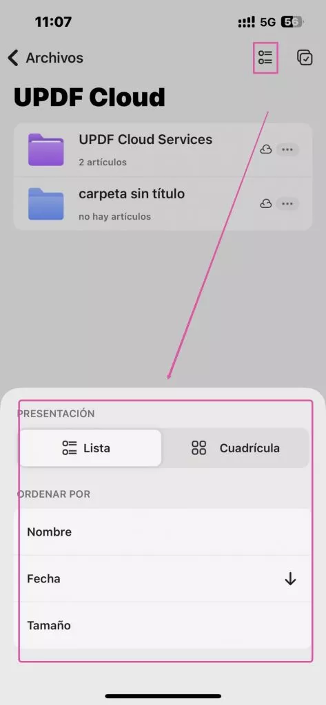 Los archivos cargados aparecerán en la carpeta de la nube. Puede cambiar la visualización de archivos entre cuadrícula y lista, además de ordenarlos por diferentes criterios como "Nombre", "Fecha" o "Tamaño" según sus necesidades.