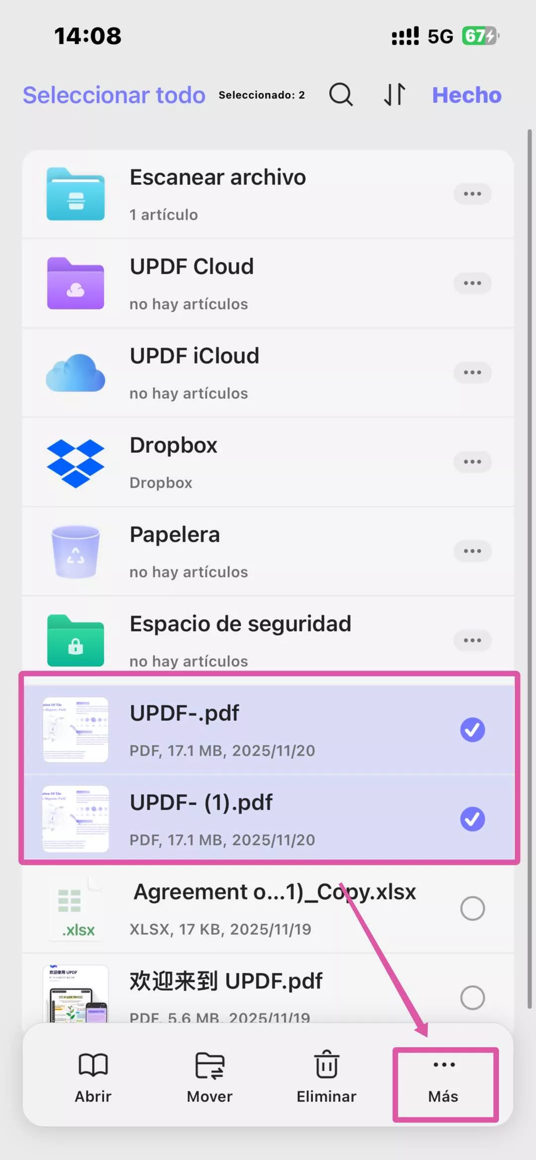 - Selecciona los archivos que deseas comprimir y toca "Más" en el menú inferior.