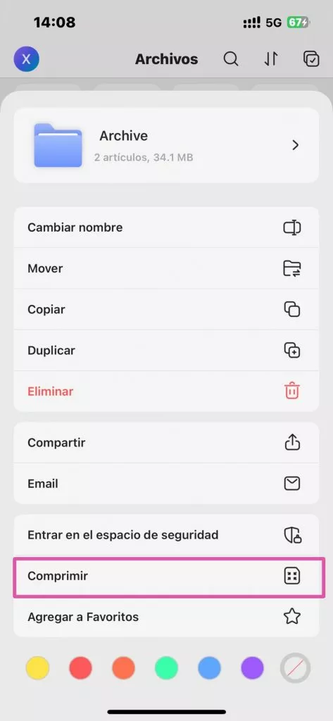 - Toca la opción "Comprimir" para comprimir los archivos seleccionados y guardarlos como un archivo comprimido.