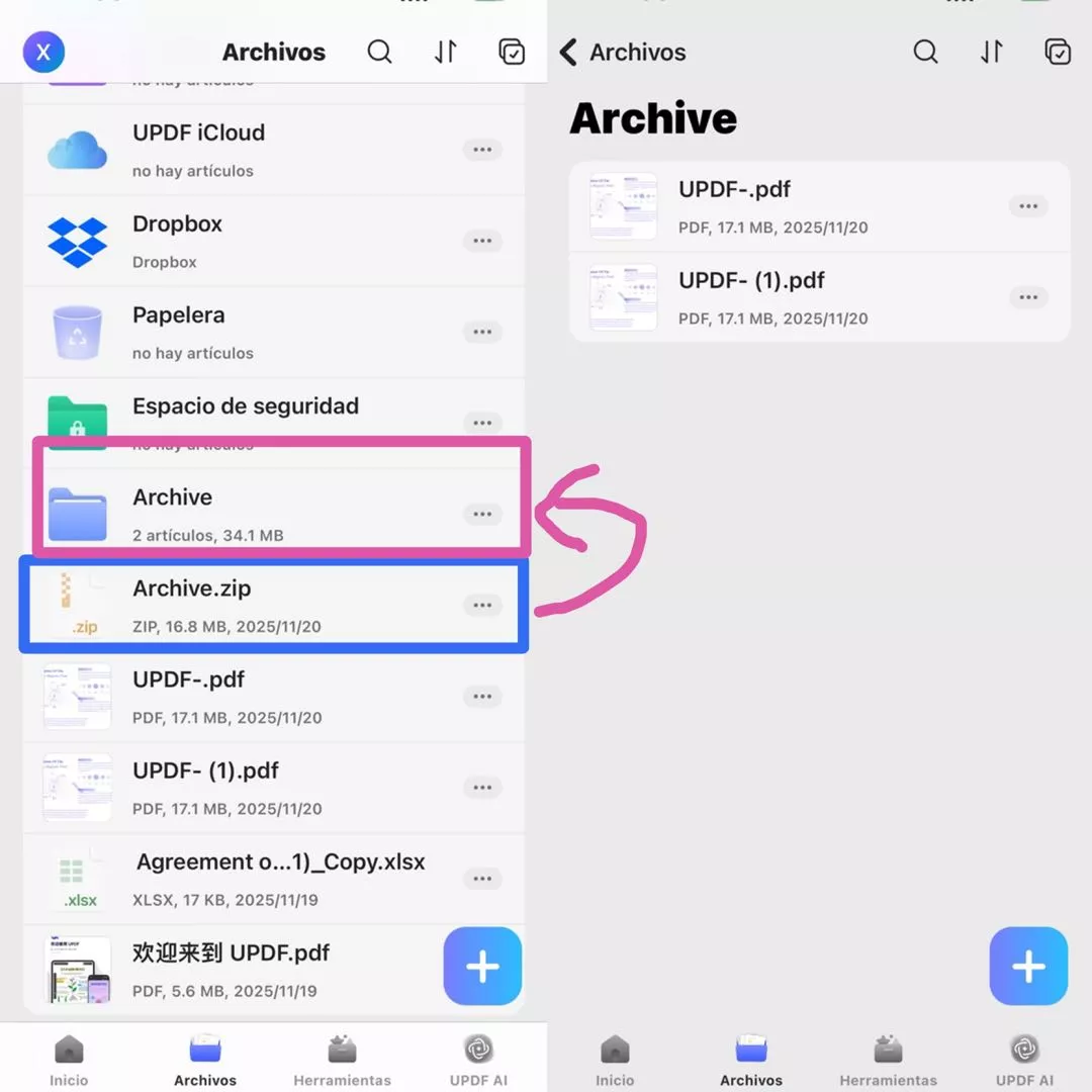 Este proceso es extremadamente simple. Todo lo que necesitas hacer para abrir un archivo comprimido en UPDF es tocarlo. Esto desempaquetará inmediatamente el archivo ZIP y creará un archivo con el mismo nombre. Los archivos del ZIP se encontrarán en la interfaz principal, descomprimidos y listos para usarse.
