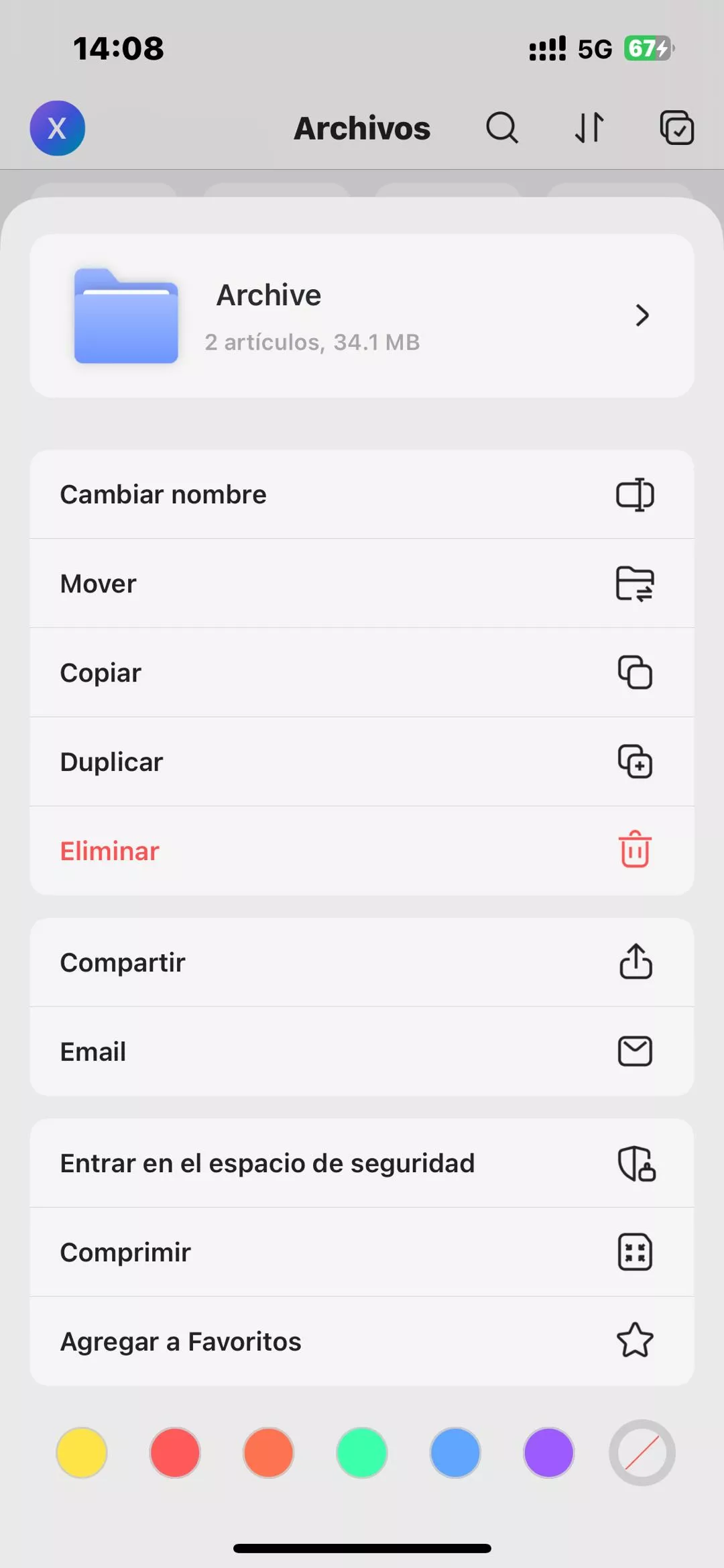 - Haz clic en el ícono de los tres puntos del archivo ZIP. Podrás renombrar el archivo ZIP, moverlo a otra ubicación, crear una copia, duplicarlo, eliminarlo, compartirlo con otros, enviarlo por correo electrónico, moverlo a un espacio seguro para mayor protección o agregar el archivo ZIP a tu lista de archivos favoritos para un acceso más fácil. También puedes marcar el archivo ZIP con diferentes colores para encontrarlo más fácilmente..