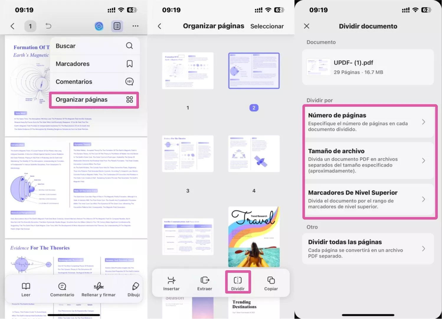 Para utilizar esta función, pulse el icono «Más» situado en la esquina superior derecha y utilice la opción «Organizar páginas». A continuación, seleccione la opción «Dividir» para ver los distintos modos de división.