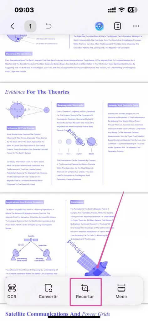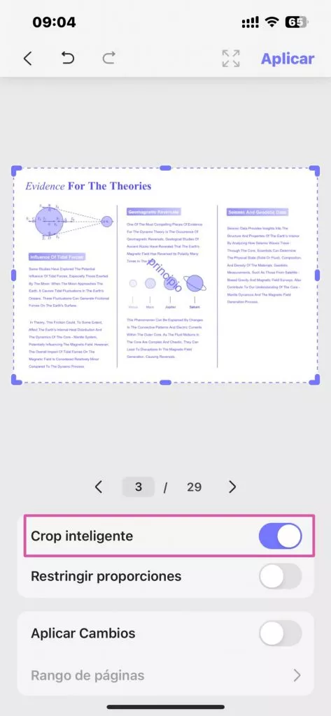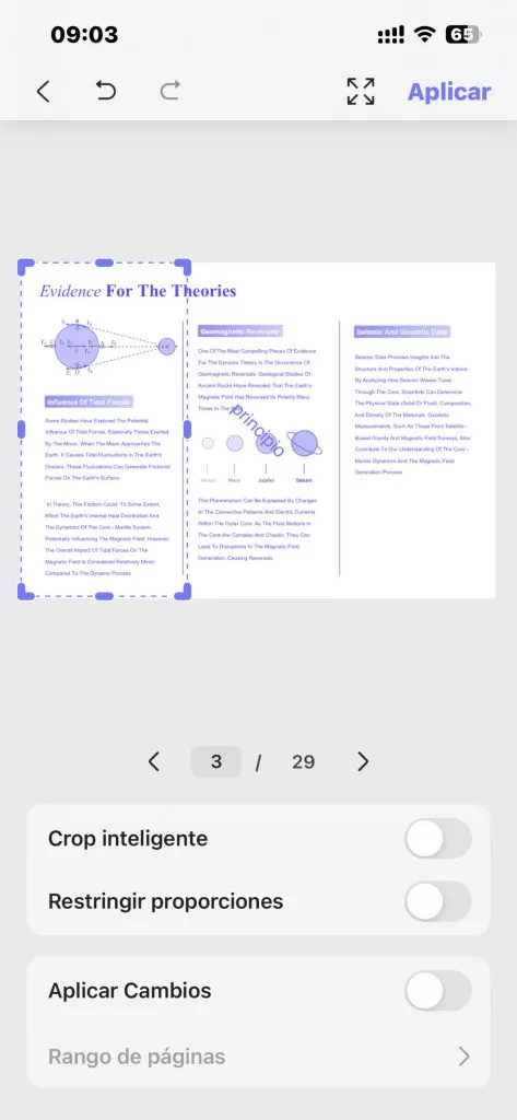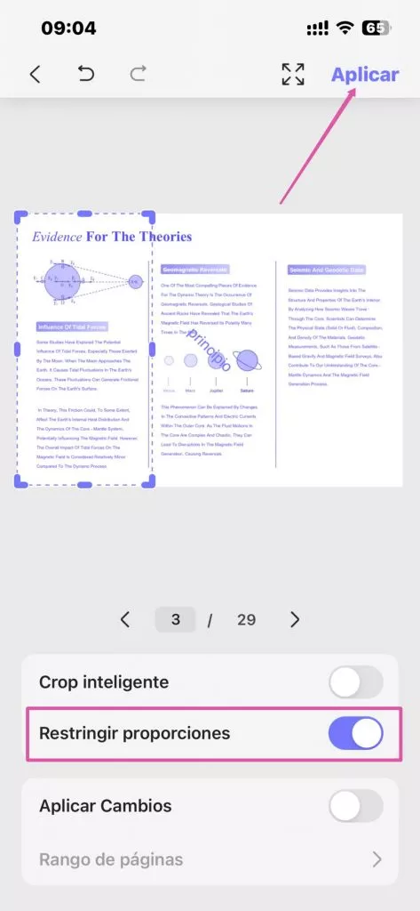 Si desea elegir una relación de aspecto fija para recortar la página, active la opción «Restringir proporciones». Una vez que haya terminado de recortar el área deseada, active la opción «Aplicar cambios» y pulse la opción «Aplicar» en la esquina superior derecha.