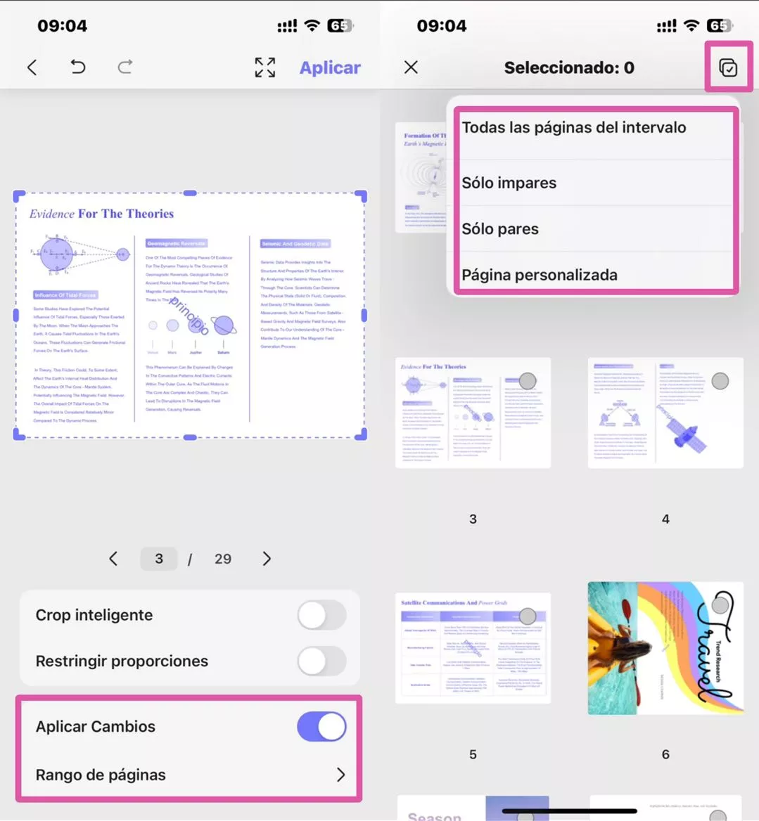 Instrucciones. Después de recortar una página y habilitar la opción «Aplicar cambios», pulsa la opción «Rango de páginas». A continuación, selecciona el icono «Seleccionar», donde podrás acceder a más opciones para seleccionar todas las páginas, las pares, las impares o un rango de páginas personalizado. También puedes seleccionar las páginas manualmente para recortarlas.