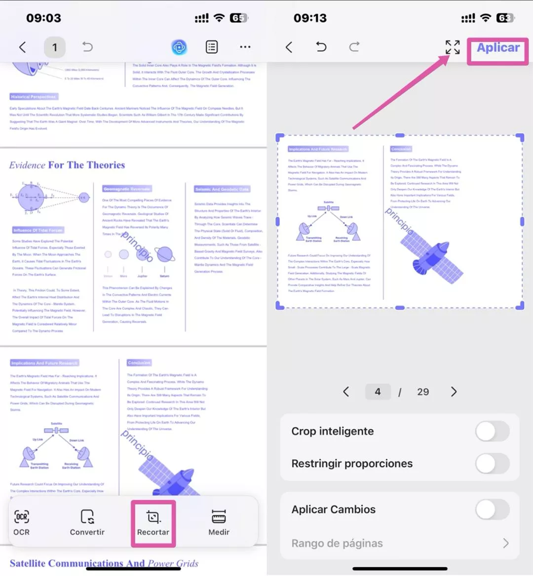 Activa la opción «Recorte inteligente» y deja que la aplicación capture los límites del contenido para obtener un recorte automático más limpio.