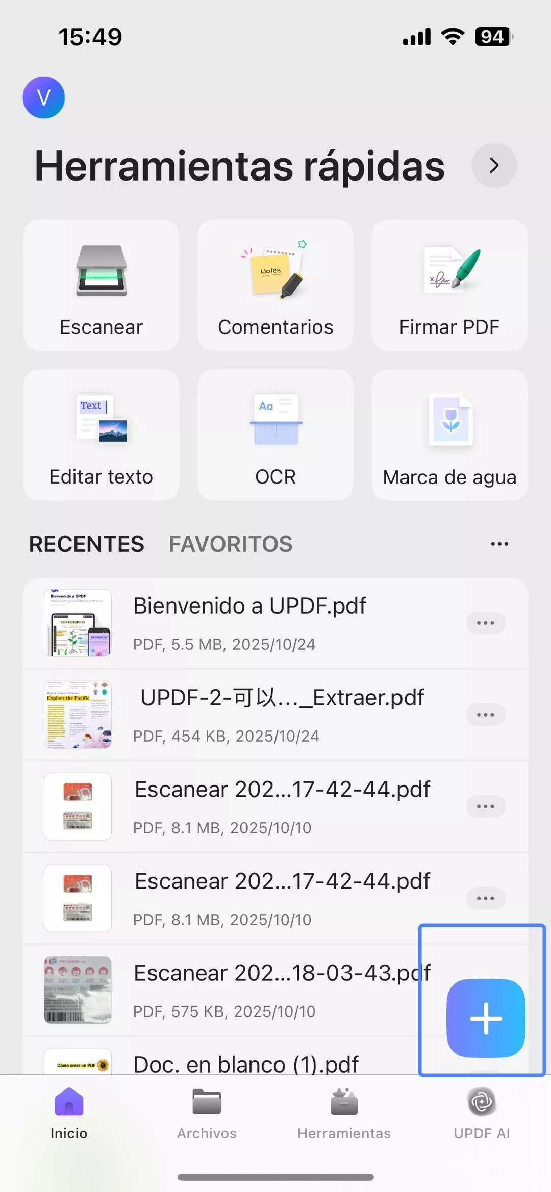 Paso 1. Haz clic en “+” y selecciona “Archivos” en la opción “IMPORTAR DESDE”. Elige el archivo PDF que deseas importar a la aplicación UPDF.