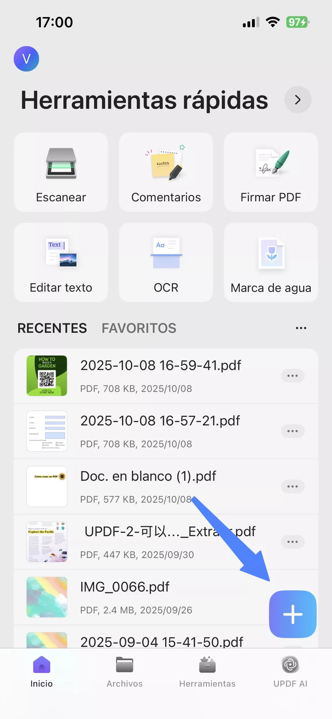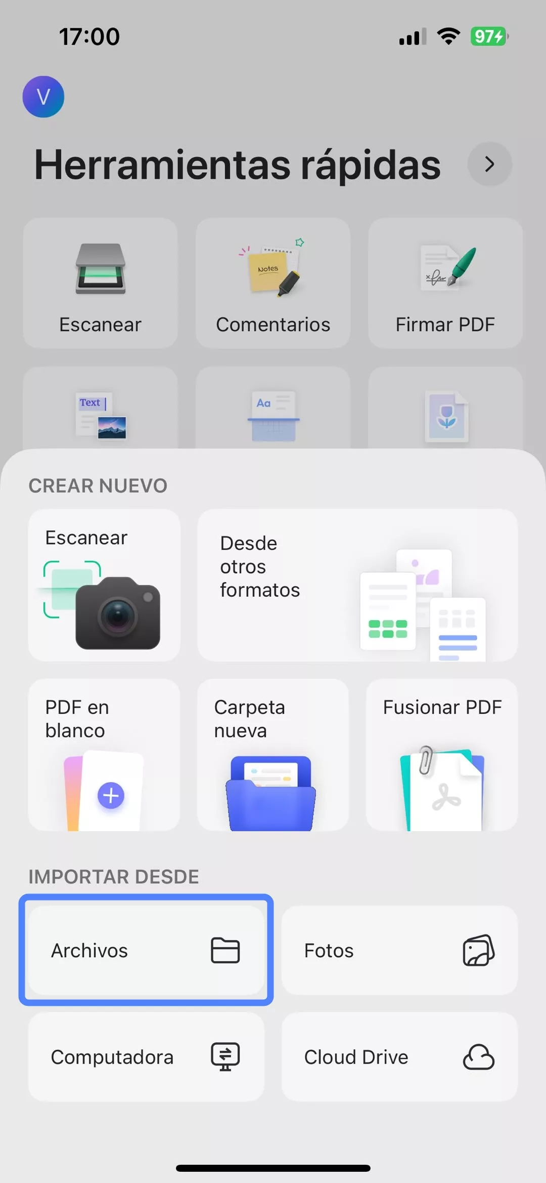 Paso 1. Abre la app UPDF para iOS. Haz clic en “+” y selecciona “Archivos” en la opción “IMPORTAR DESDE”. Selecciona el archivo PDF que deseas importar a la aplicación UPDF.