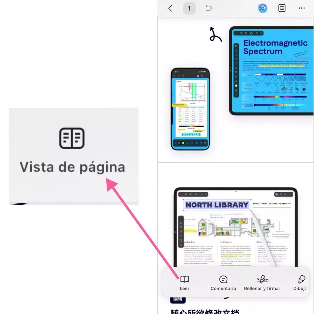 - Vista de Página: Esta sección te permite elegir entre los modos de visualización "Página única" y "Dos páginas" para tu documento.