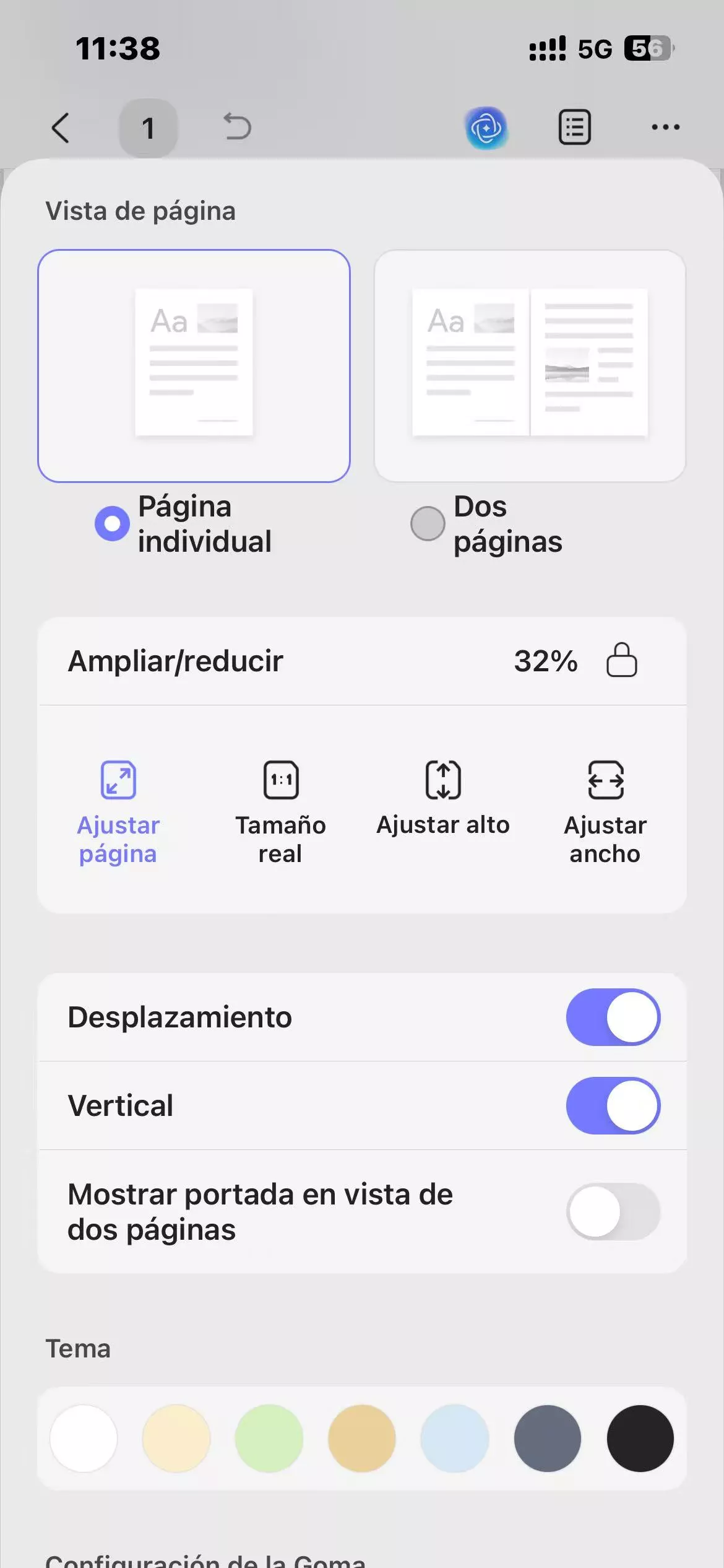- Tema: Puedes cambiar el tema de color general de la interfaz de visualización del documento.