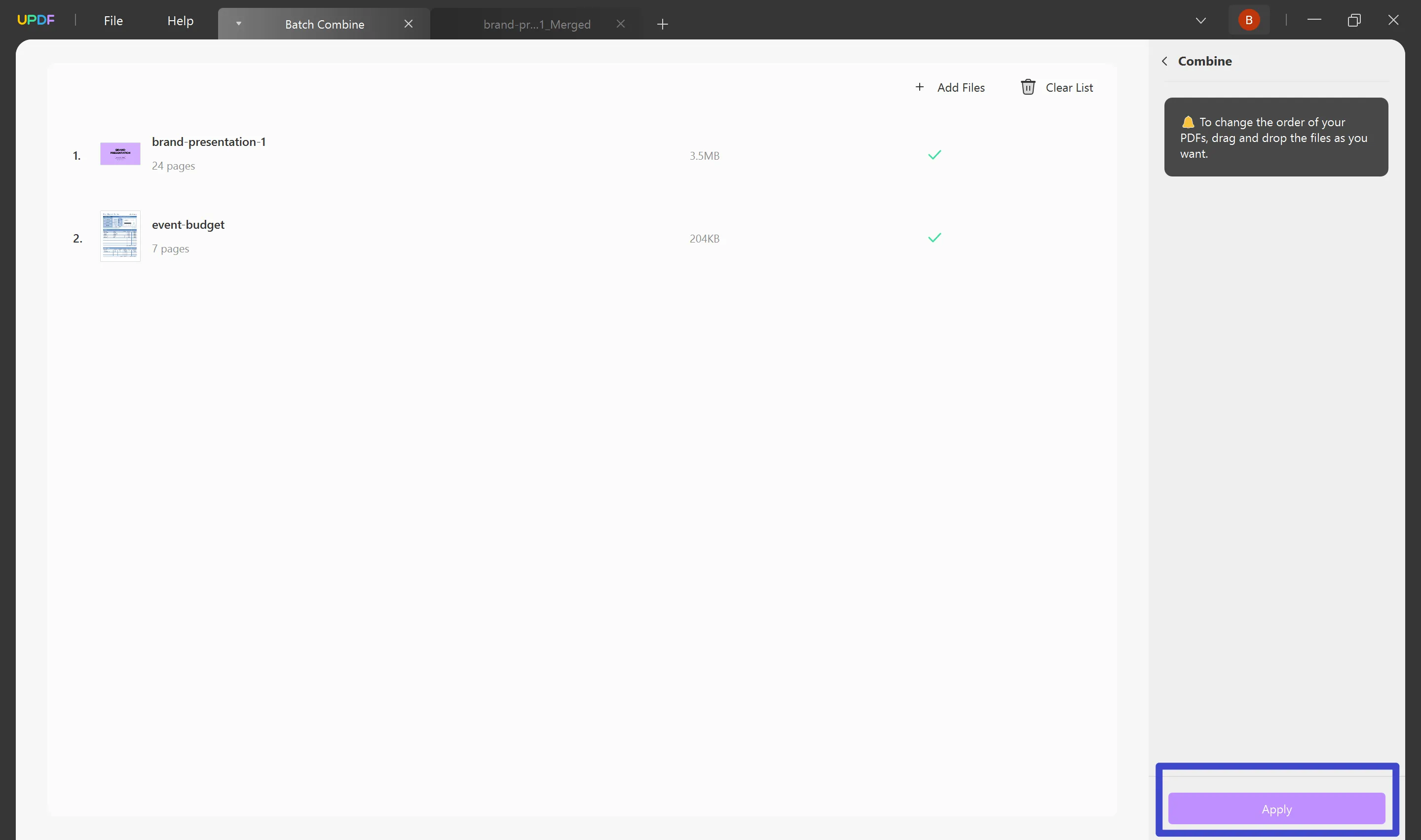 - Launch UPDF and click the Batch option, and then click the "Combine" button.