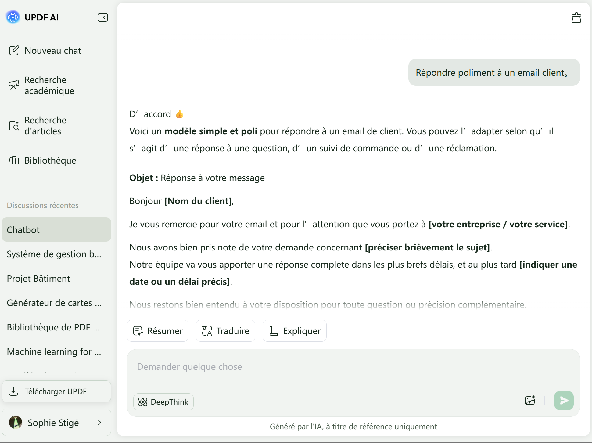 • Étape 3 : Cliquez sur Envoyer et laissez UPDF AI générer une réponse professionnelle et soignée que vous pourrez réviser, modifier si nécessaire, et utiliser pour vos emails, réseaux sociaux, rapports ou toute communication.