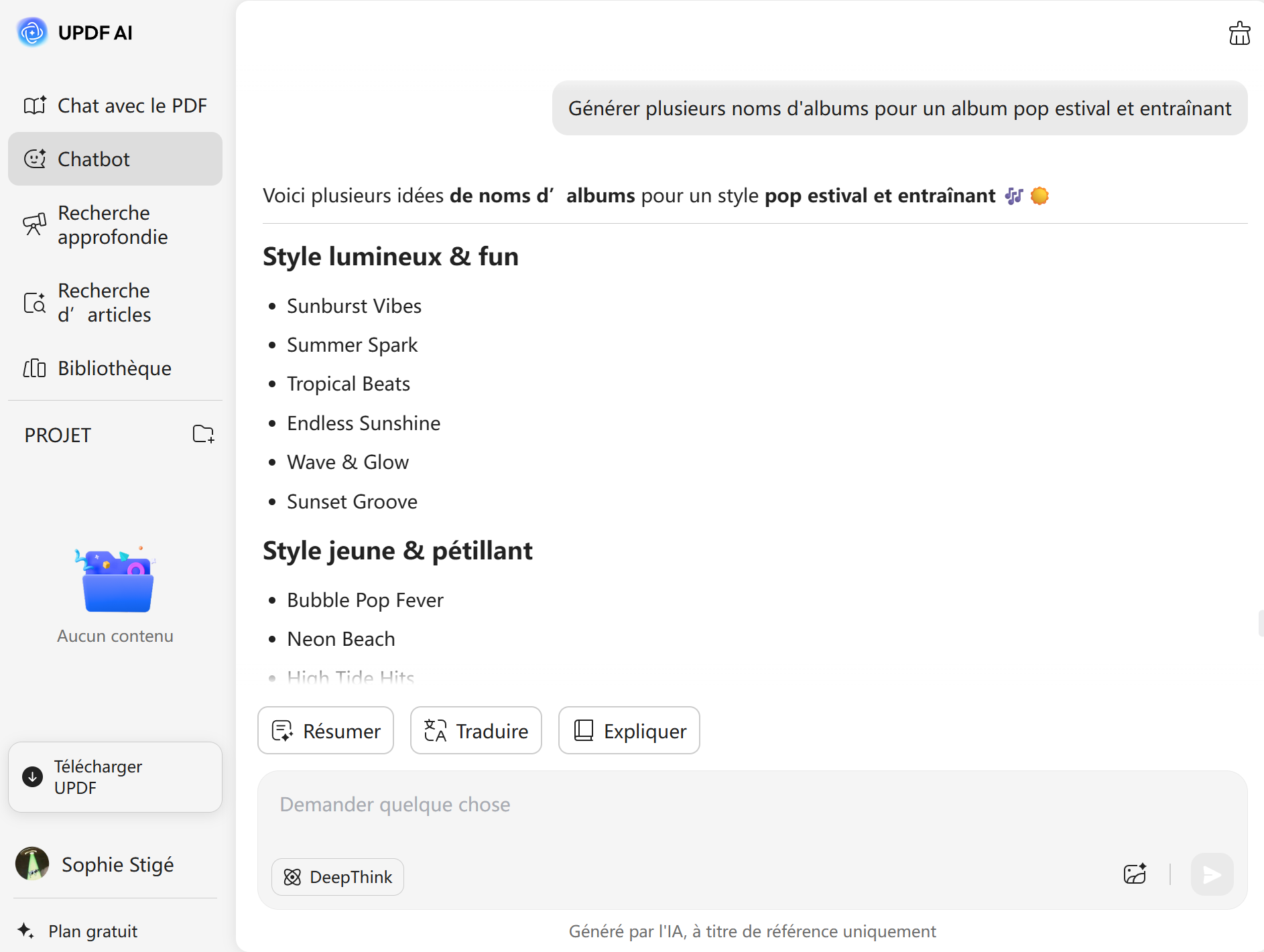 Utilisez UPDF AI Générateur de noms d'albums gratuit pour créer des noms amusants et uniques pour des albums de musique, EP, singles ou playlists. Il suffit de saisir une requête telle que « Générer plusieurs noms d'albums pour un album pop estival et entraînant », puis de cliquer sur Envoyer.