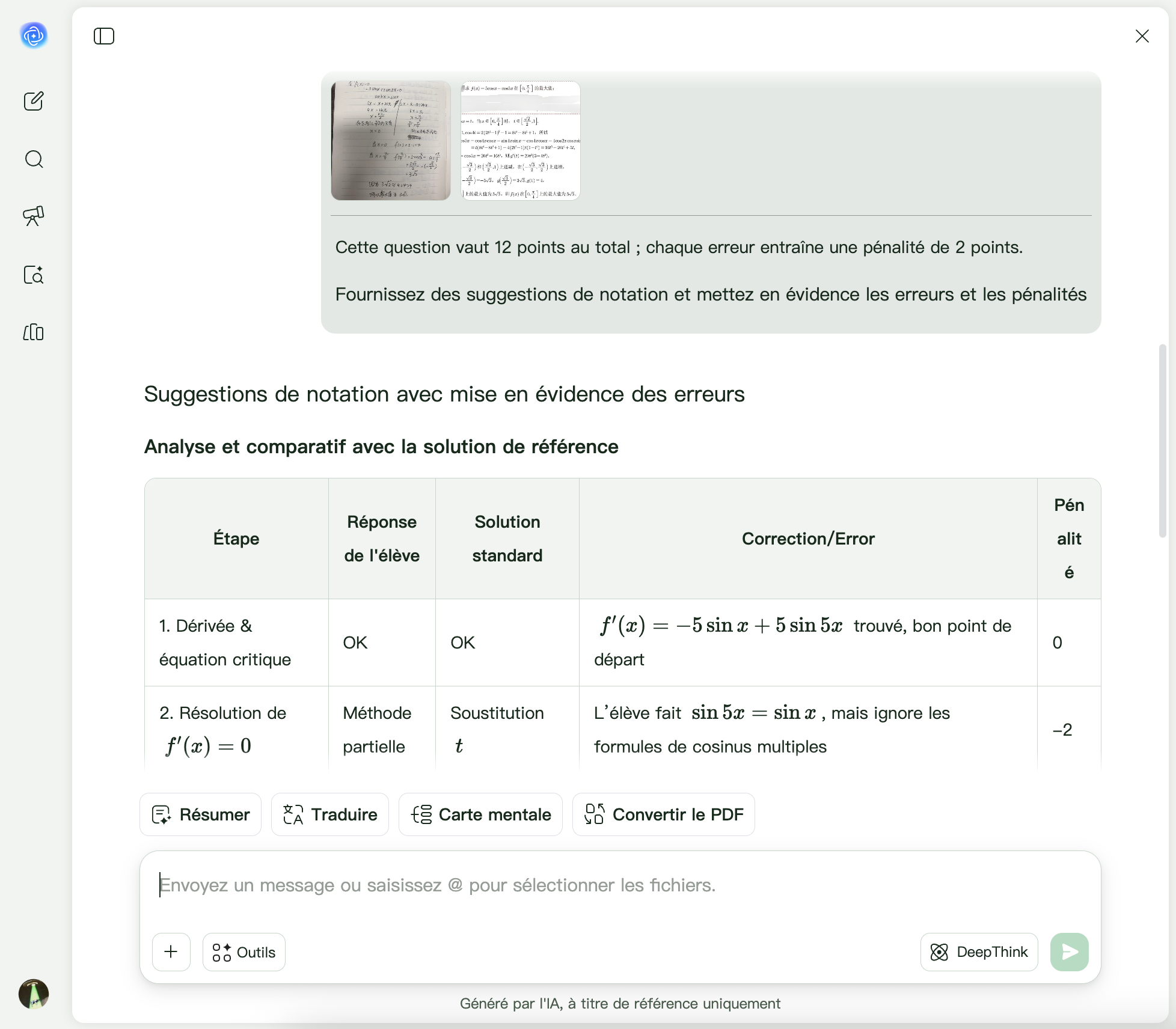 Téléchargez les devoirs des étudiants et les réponses de référence (PDF, texte ou images). UPDF AI reconnaît automatiquement le contenu pour la correction. Utilisez des invites comme « Noter selon les réponses de référence » ou « Mettre en évidence les erreurs et les points retirés ».