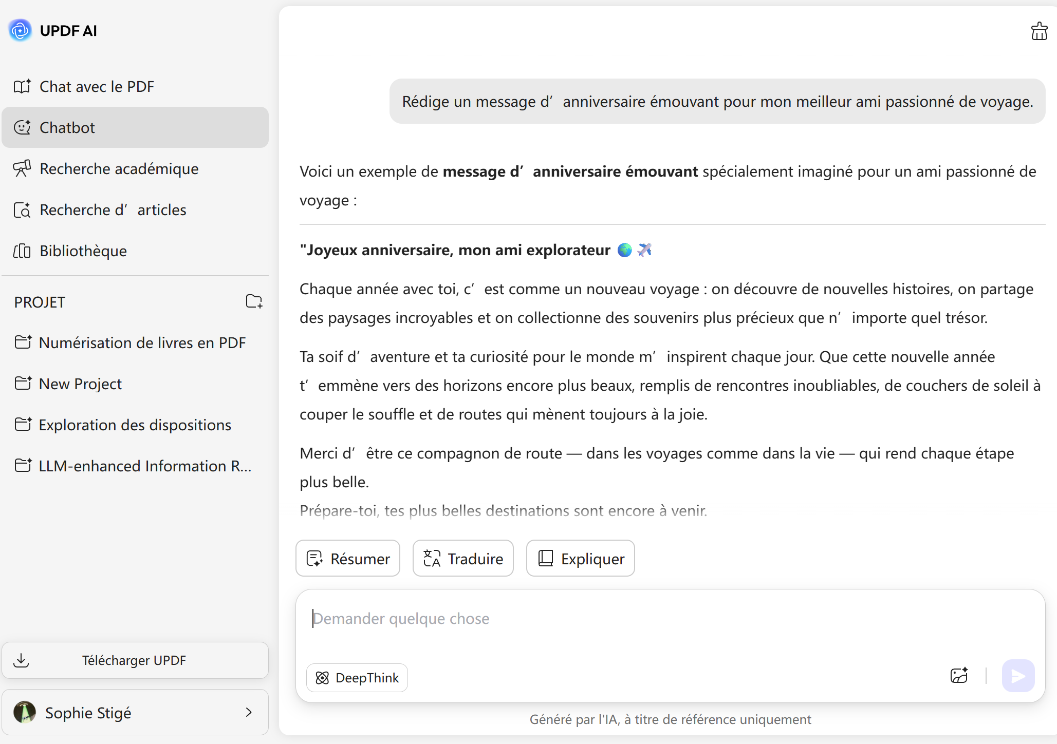 Contrairement aux outils d'écriture IA généralistes, UPDF AI Générateur de vœux d'anniversaire est conçu pour créer des souhaits d'anniversaire adaptés à chaque destinataire. Il comprend différents tons, tels que humoristique, romantique ou professionnel, afin d'assurer un message parfaitement adapté à l'occasion et à la personne.