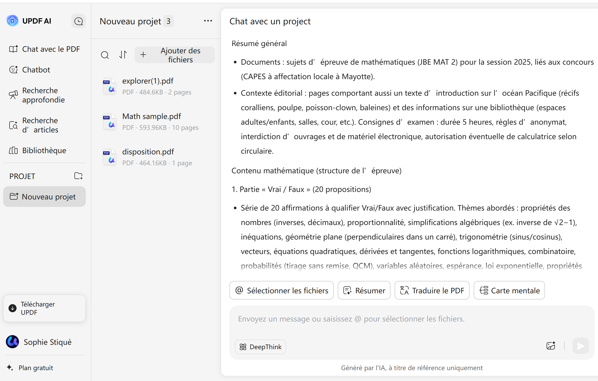 Vous pourrez ensuite analyser le contenu, utiliser des outils comme « Résumer », « Traduire le PDF », « Carte mentale », ou saisir une requête dans la zone de texte pour interroger le PDF et cliquer sur « Réflexion approfondie » pour des insights plus profonds.