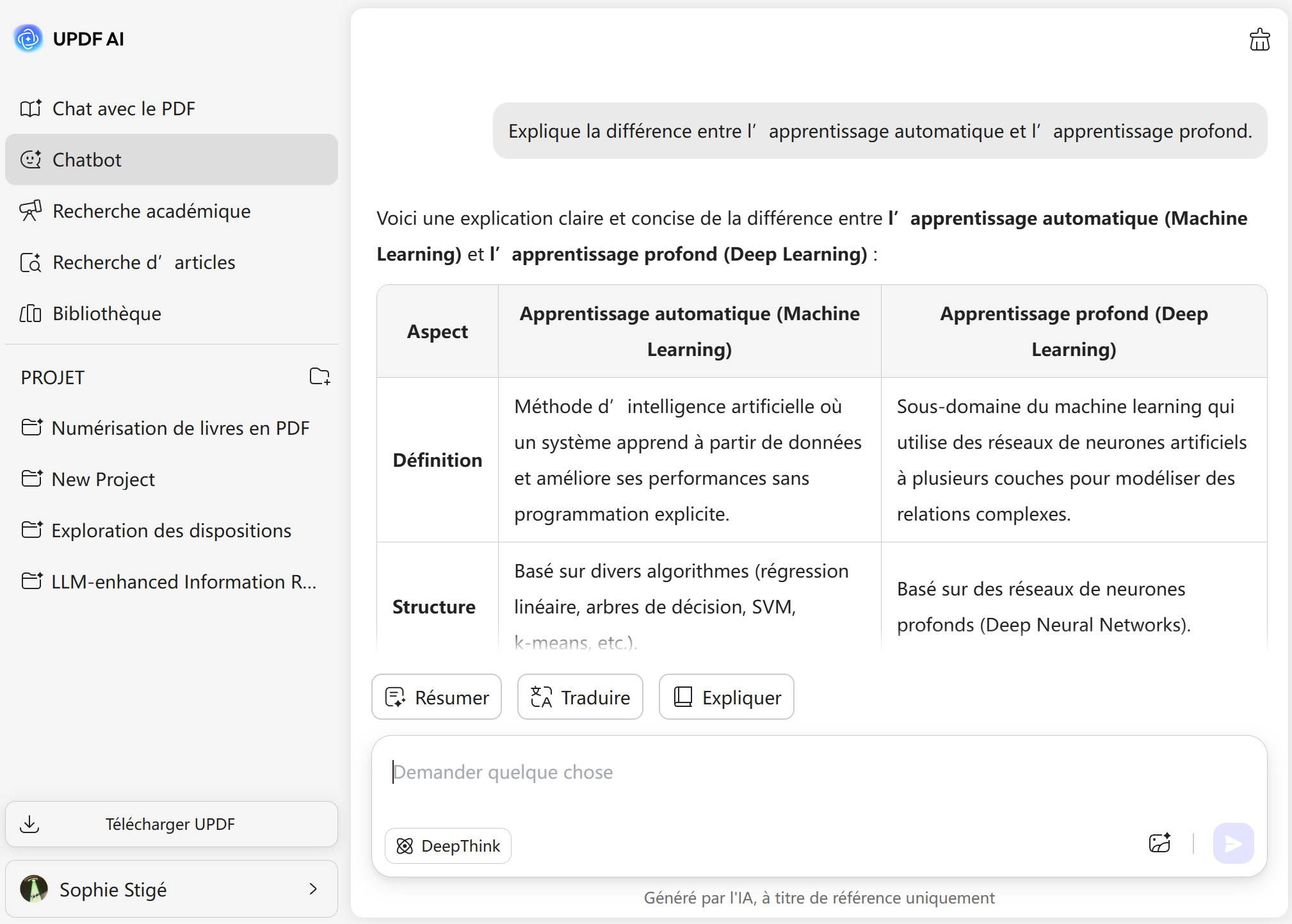 Les professionnels travaillant sur des rapports, contrats ou documents métier peuvent compter sur UPDF AI – une alternative puissante à ChatGPT – pour résumer des PDF volumineux, extraire des informations clés et répondre immédiatement à des questions précises. Il fluidifie les processus et renforce la productivité grâce à la précision de l’IA.