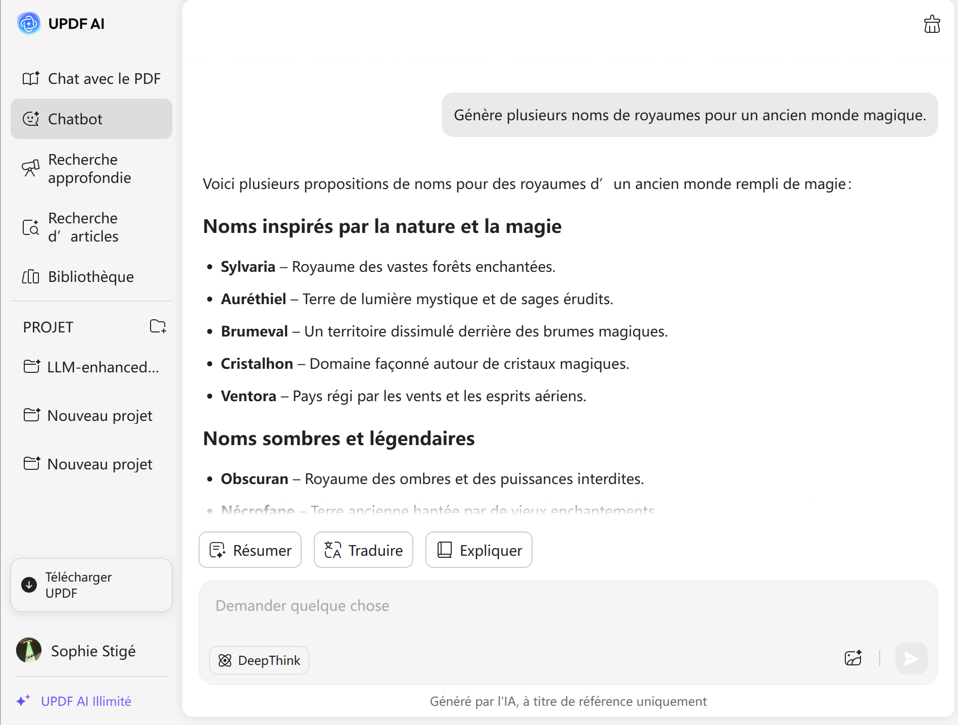 Tapez simplement une invite et recevez en quelques secondes une large gamme de noms de royaumes originaux. UPDF AI vous fait gagner des heures de brainstorming, vous permettant de vous concentrer sur l’essentiel : construire votre univers fantastique avec profondeur, créativité et cohérence.