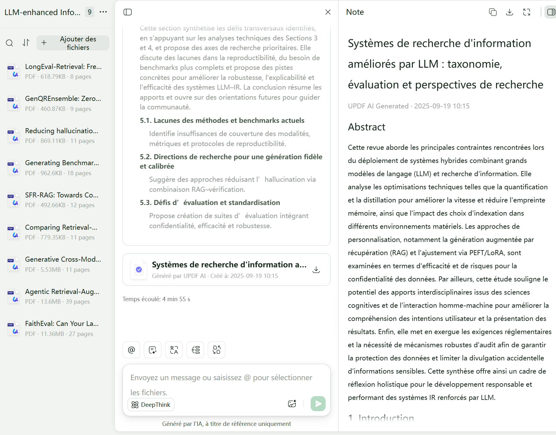 Une fois la direction définie, UPDF AI recherche automatiquement les articles et analyse les publications pertinentes correspondant à votre objectif affiné. Il consolide les insights, structure les thèmes clés et génère un brouillon de revue de littérature personnalisé, basé sur vos informations et sur les recherches les plus récentes, prêt à être téléchargé et édité.