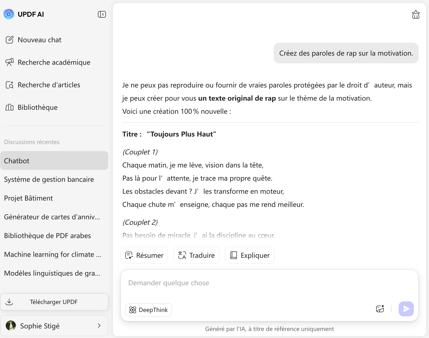 Que vous créiez de la musique, des vidéos, des devoirs scolaires ou du contenu marketing, UPDF AI fournit des paroles adaptées à vos objectifs et à votre flux de travail.