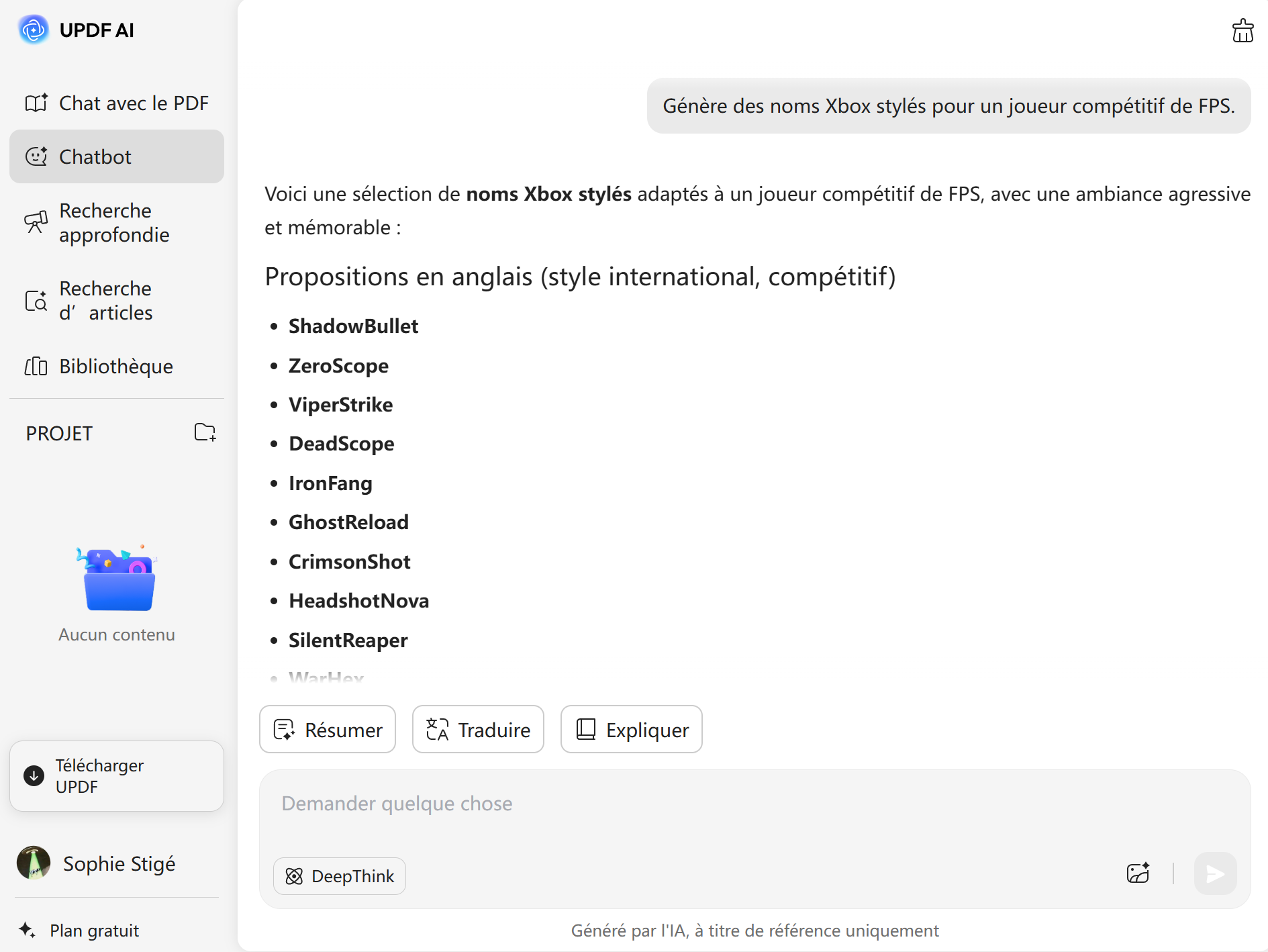 Choisissez votre modèle d’IA. UPDF AI utilise par défaut ChatGPT-5, mais vous pouvez passer à DeepSeek R1 en sélectionnant DeepThink pour obtenir des idées de noms plus créatives ou originales.