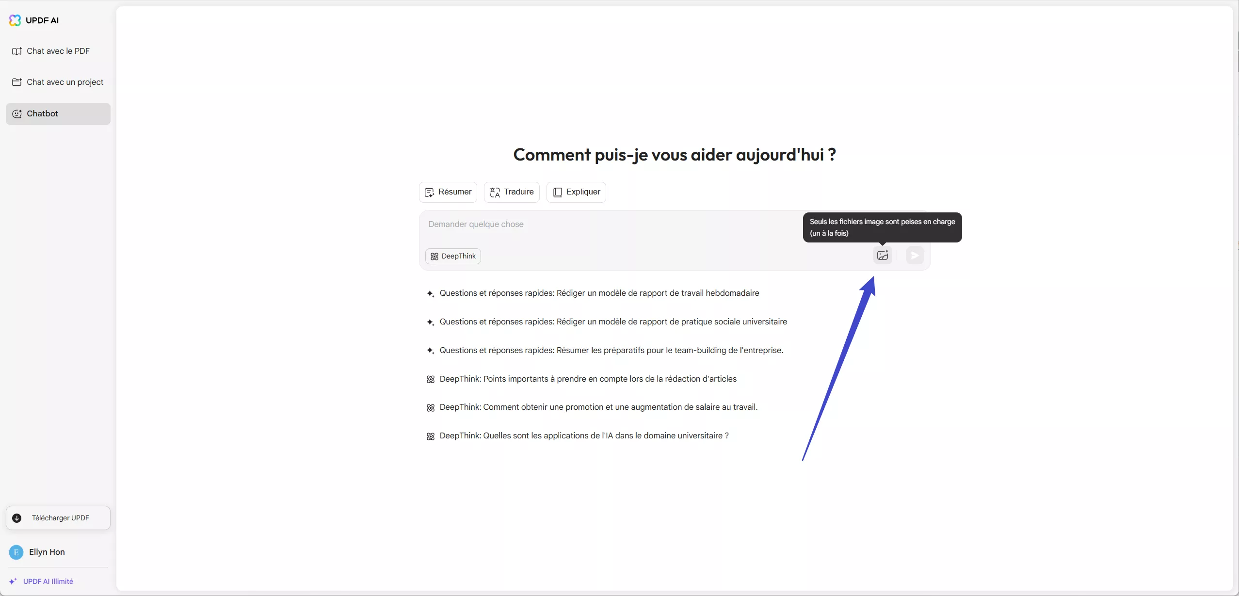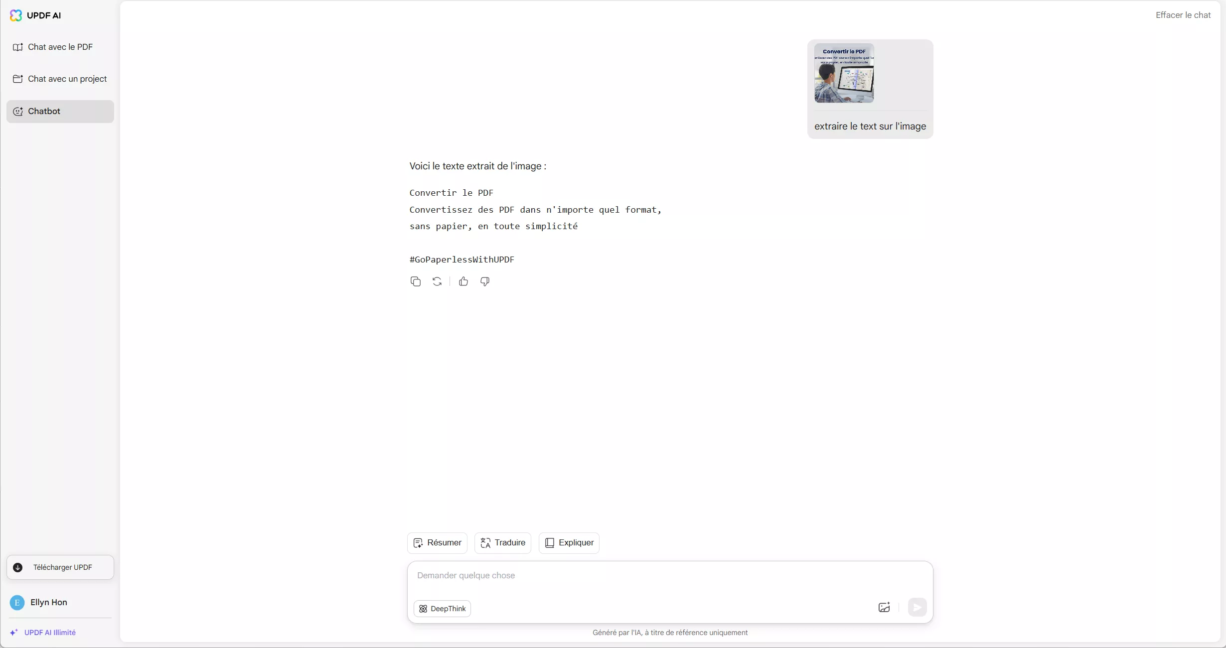 L'assistant IA en ligne d'UPDF se distingue comme une option remarquable pour les utilisateurs souhaitant extraire efficacement du texte à partir d'images. UPDF brille grâce à sa fonctionnalité innovante de « Chatter avec image », permettant aux utilisateurs de télécharger directement des images ou des captures d'écran de documents papier et d'engager un dialogue avec l'IA. Plus encore, il prend en charge la reconnaissance de texte manuscrit. L'assistant peut non seulement extraire du texte, mais aussi fournir des explications, des résumés, et bien plus, en faisant un outil précieux pour les étudiants, les professionnels, et tout utilisateur ayant besoin d'un traitement rapide de documents.